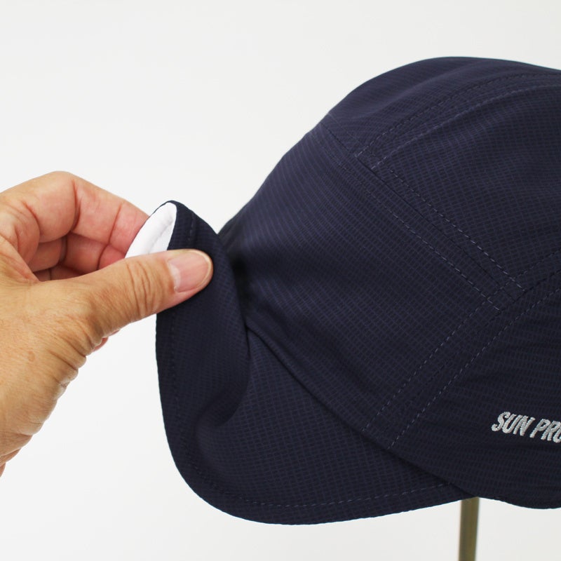 本製品は、そのご要望の声を受けて出来上がったUVカットキャップです。固い芯が入っていない「つば」は柔らかく、つば先端にはコードが入っているので形状を保ちながら安全に被る事ができます。