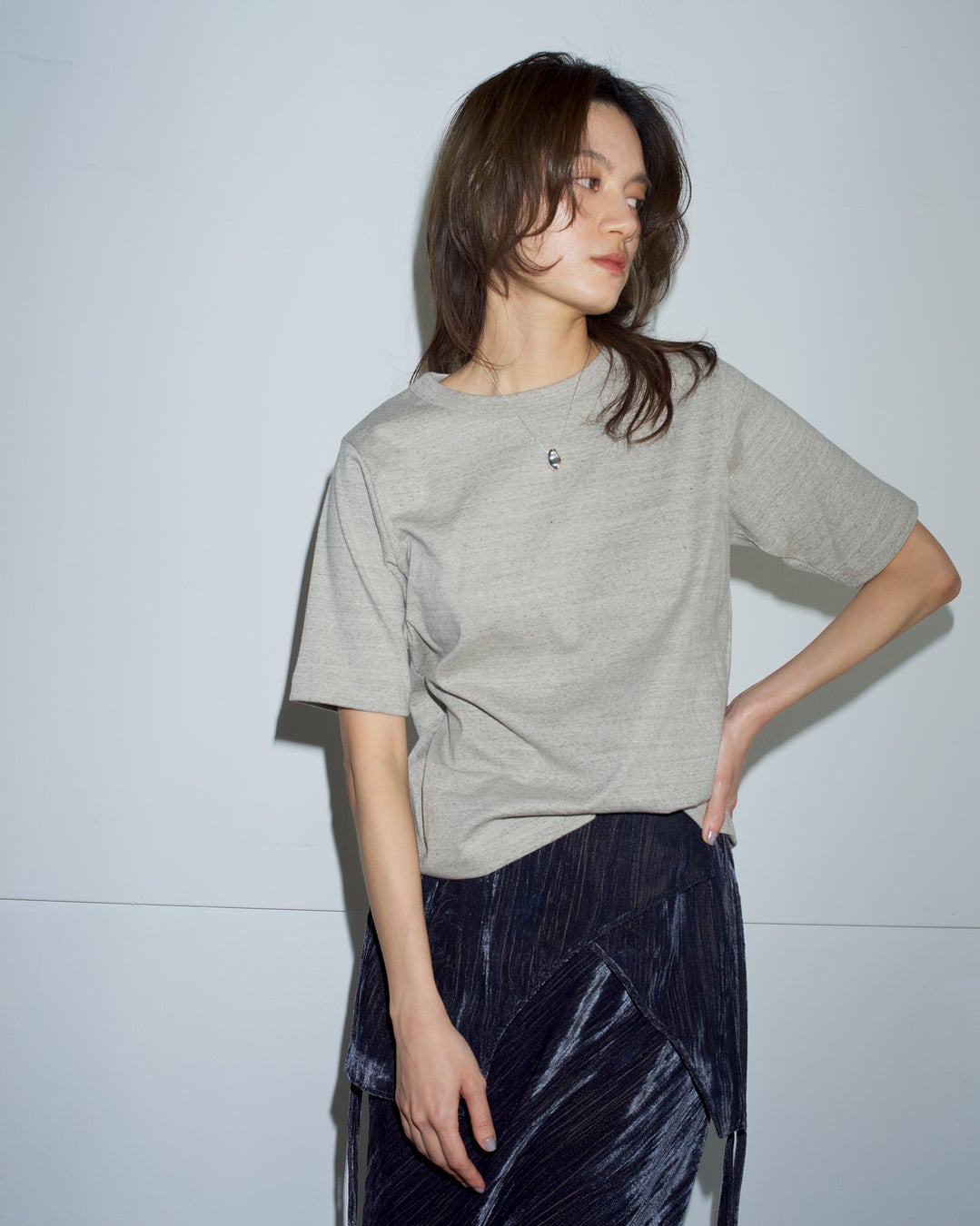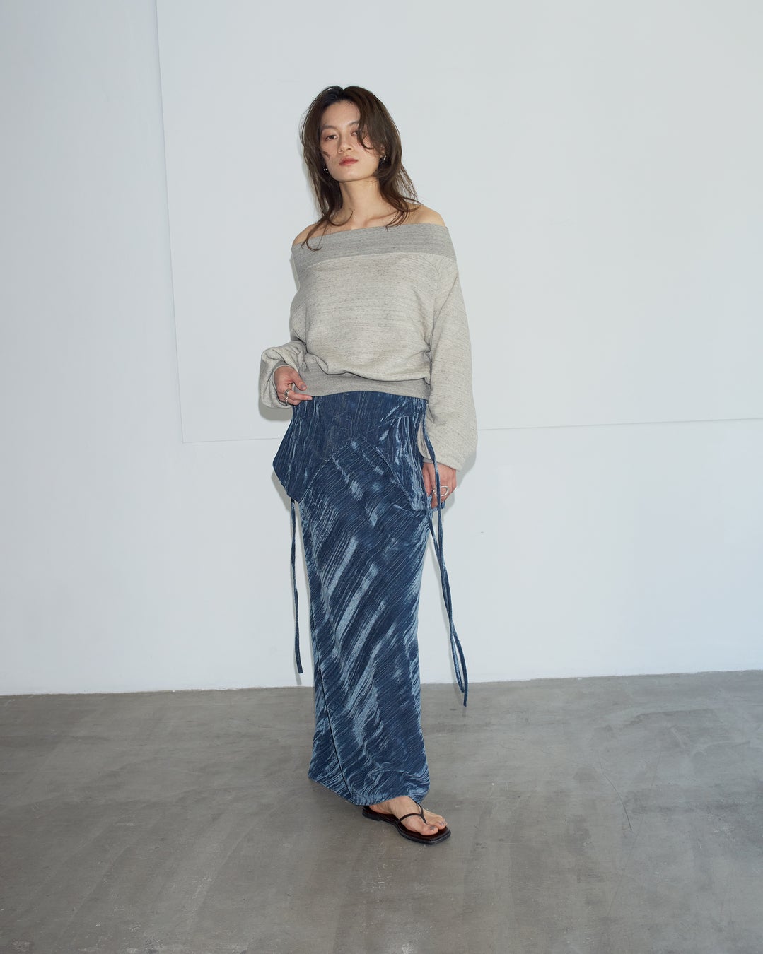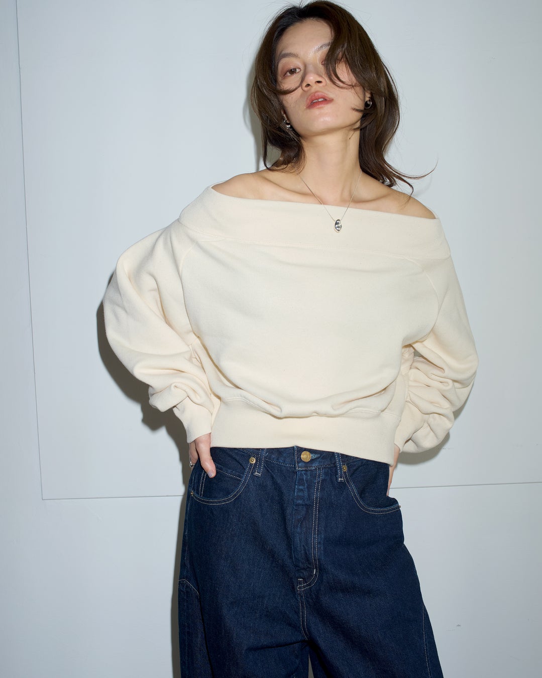 "染色しない"ことをコンセプトにした「UNDYED」の素材を使用したオフショルダースウェット。オーガニックコットン本来の色をそのまま活かし、無染色ならではの柔らかさと心地よさが魅力です。リブ仕様のネックで着心地が良く、ゆったりとしたシルエットでラフに着られます。背中の大胆なカッティングが女性らしさを引き立て、ベロアスカートなどを合わせたミックススタイルもおすすめです。