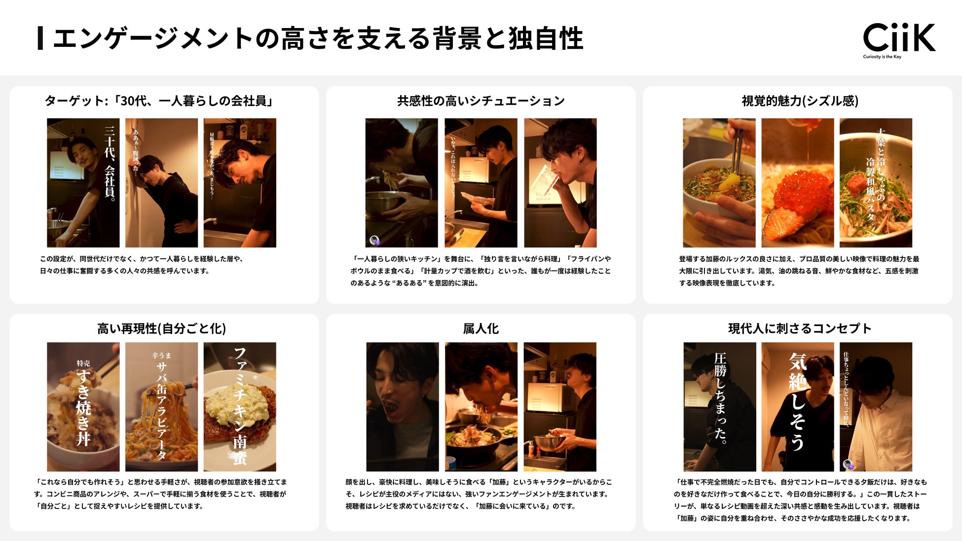 共感性の高いシチュエーション設計、思わず食べたくなるような視覚的なシズル感、高い再現性(自分ごと化しやすいレシピ)、人物像を感じられるキャラクター設計、そして現代人の心に刺さるコンセプトによって、アカウント開設当初から高いエンゲージメントを獲得してきました。