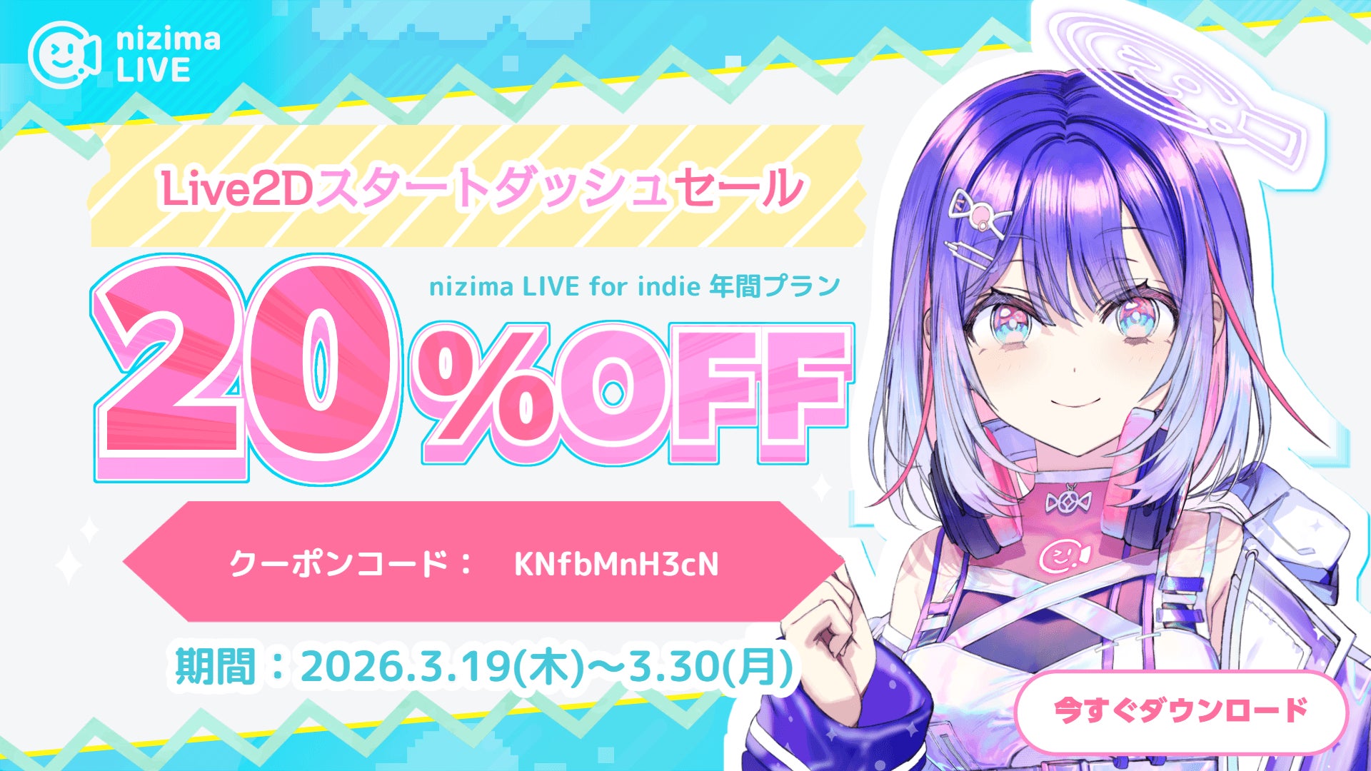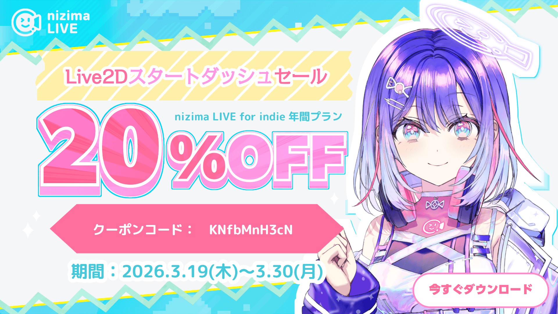 「nizima LIVE Indie 年間プラン」も20%OFFでご購入頂けるクーポンを配布します。Live2D Cubism PROとnizima LIVEをセットでお得にはじめるチャンス!