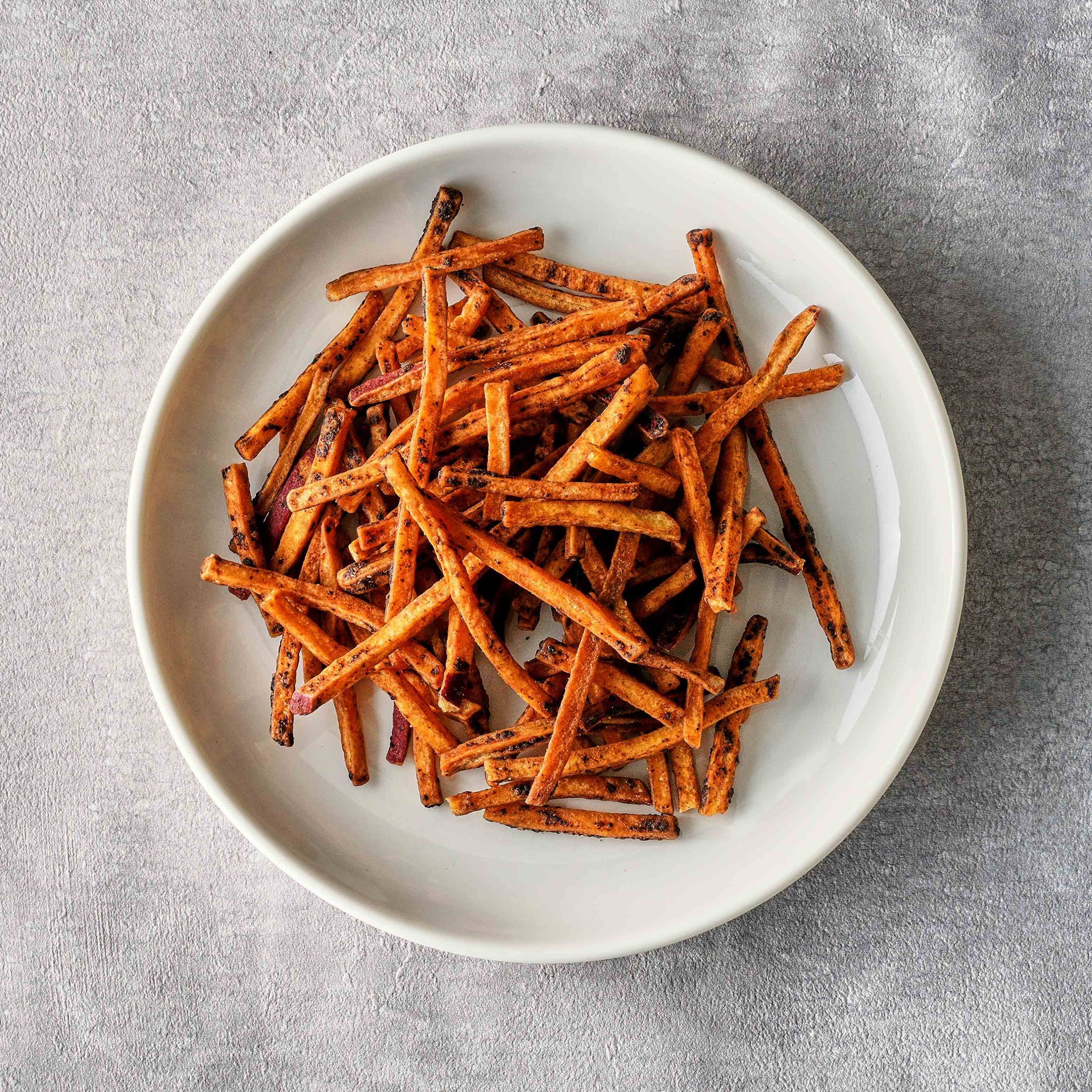 深煎りにしたエルサルバドルのシングルオリジンコーヒーを細かく砕き、蜜に混ぜてお芋に絡めました。長期間熟成した紅はるかを使用し、食感と味わいがベストに感じられる細さ(4㎜)です。
