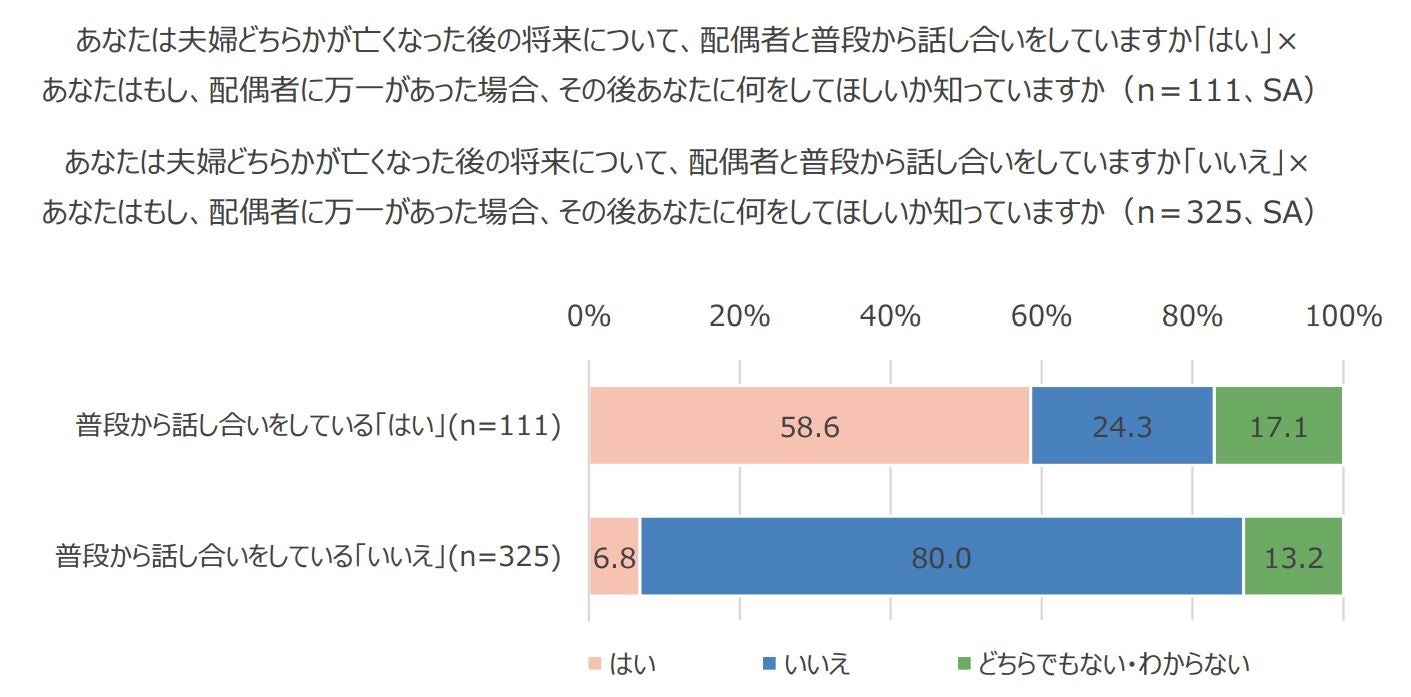 夫婦どちらかが亡くなった後の将来について、配偶者と普段から話し合いをしている人の方が、そうでない人よりも配偶者に万一があった場合、その後何をしてほしいか知っていると回答した割合が圧倒的に多いことも分かりました。