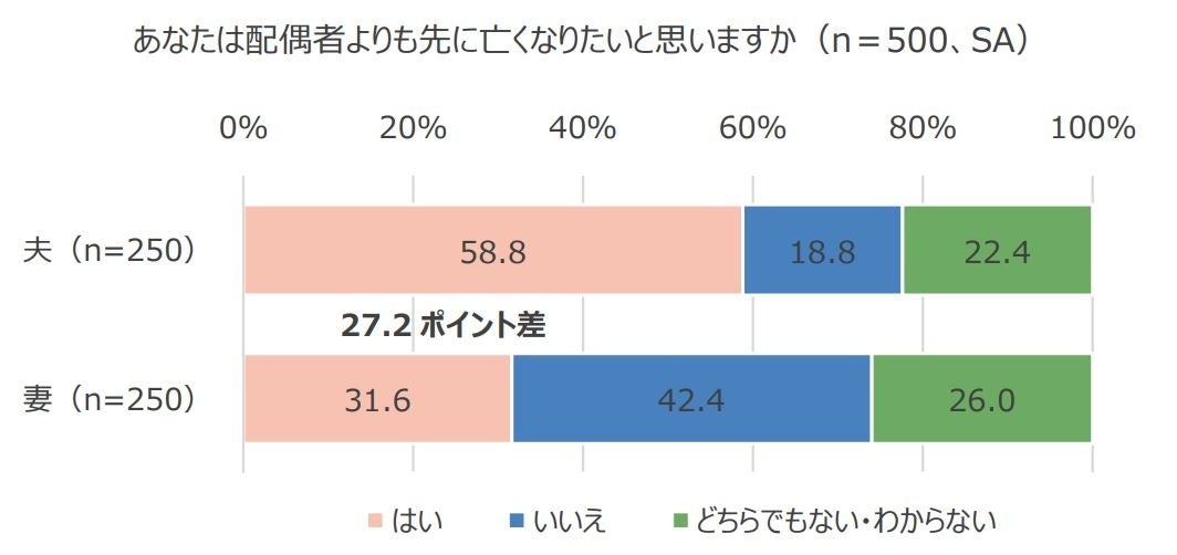 経営者と経営者の妻各250名に、配偶者よりも先に亡くなりたいと思うか聞いたところ、「はい」と回答したのは、夫58.8%、妻31.6%と、夫の方が27.2ポイント多い結果となり、夫の方が妻より先に亡くなりたいと思っている人が多いことが分かりました。