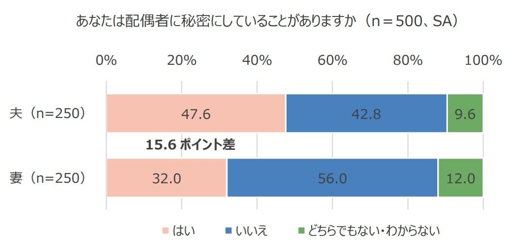 経営者と経営者の妻各250名に、配偶者に秘密にしていることがあるか聞いたところ、「はい」と回答したのは、夫47.6%、妻32.0%と、夫の方が15.6ポイント多い結果となり、夫の方が配偶者に秘密にしていることがある人が多いことが分かりました。