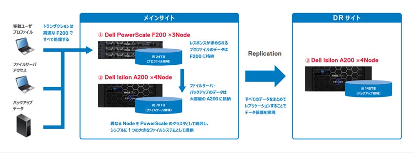 「PowerScale」による新しいストレージ基盤は、2つの異なるモデルを効果的に組み合わせて、2022年2月より本番稼働を開始しました。高速対応が要求されるユーザープロファイル領域の保存用にはオールフラッシュモデルの「PowerScale F200」を、大容量が要求される業務データ保存用にはアーカイブモデルの「Dell Isilon A200」を、それぞれ採用することで、性能要件とコスト要件をうまくバランス化させました。しかも世代やスペックの異なるモデルを統合して自動階層化する機能「SmartPools」も用意されているため、この広大なストレージ空間をワンボリュームとして利用することができました。