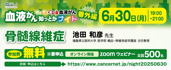 認定NPO法人キャンサーネットジャパン(東京都文京区 理事長 岩瀬 哲)は、この度「骨髄線維症」をテーマに、血液がんに関するオンラインセミナー「血液がん知っとかナイト」の番外編を開催する運びとなりました。
