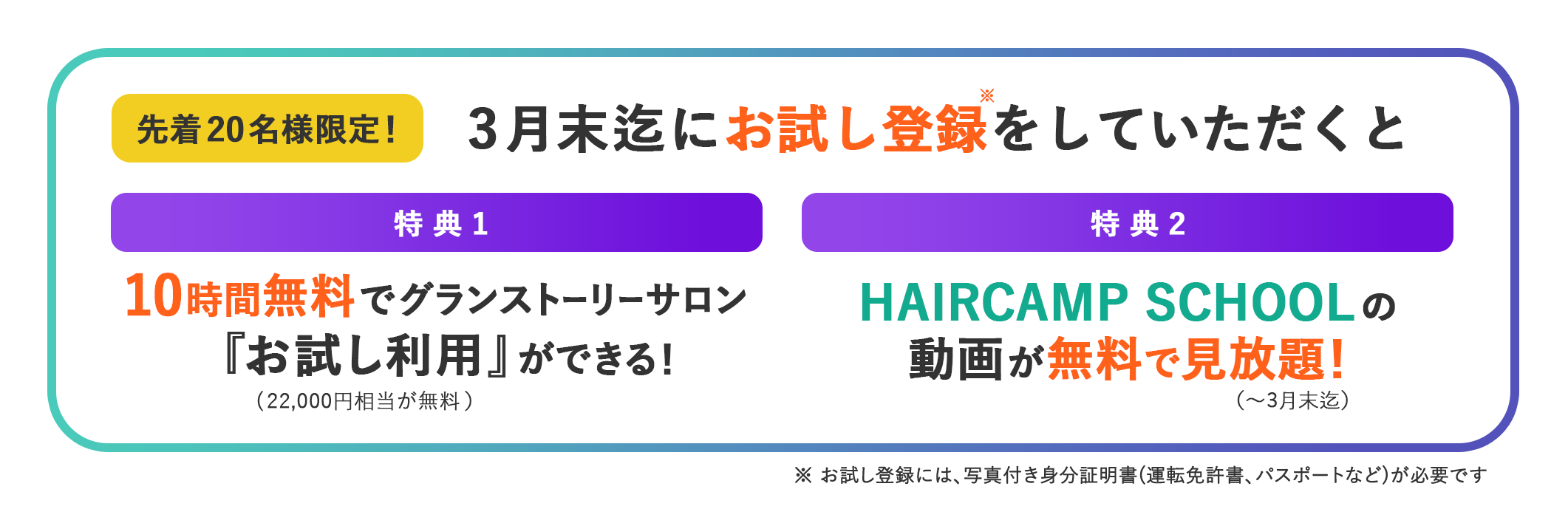 “美容業界の自由な働き方を叶える”がコンセプトのサブスクリプション(※1)型シェアサロン「GrandStory SALON(グランストーリーサロン)」を運営する株式会社フェイスネットワーク(本社:東京都渋谷区、代表取締役社長:蜂谷 二郎、以下当社)は、美容師向けオンライン学習サービス 「HAIRCAMP」を運営するHAIRCAMP株式会社(本社:東京都港区、代表取締役社長:森本 賢志)との連携により、美容師の方々が今すぐ使える技術がサブスクで学び放題の「HAIRCAMP SCHOOL」、略して『ヘアスク』が対象プランご契約中、ずーっと無料でご利用いただける、シェアサロン業界初となるサービスを開始したことをお知らせいたします。