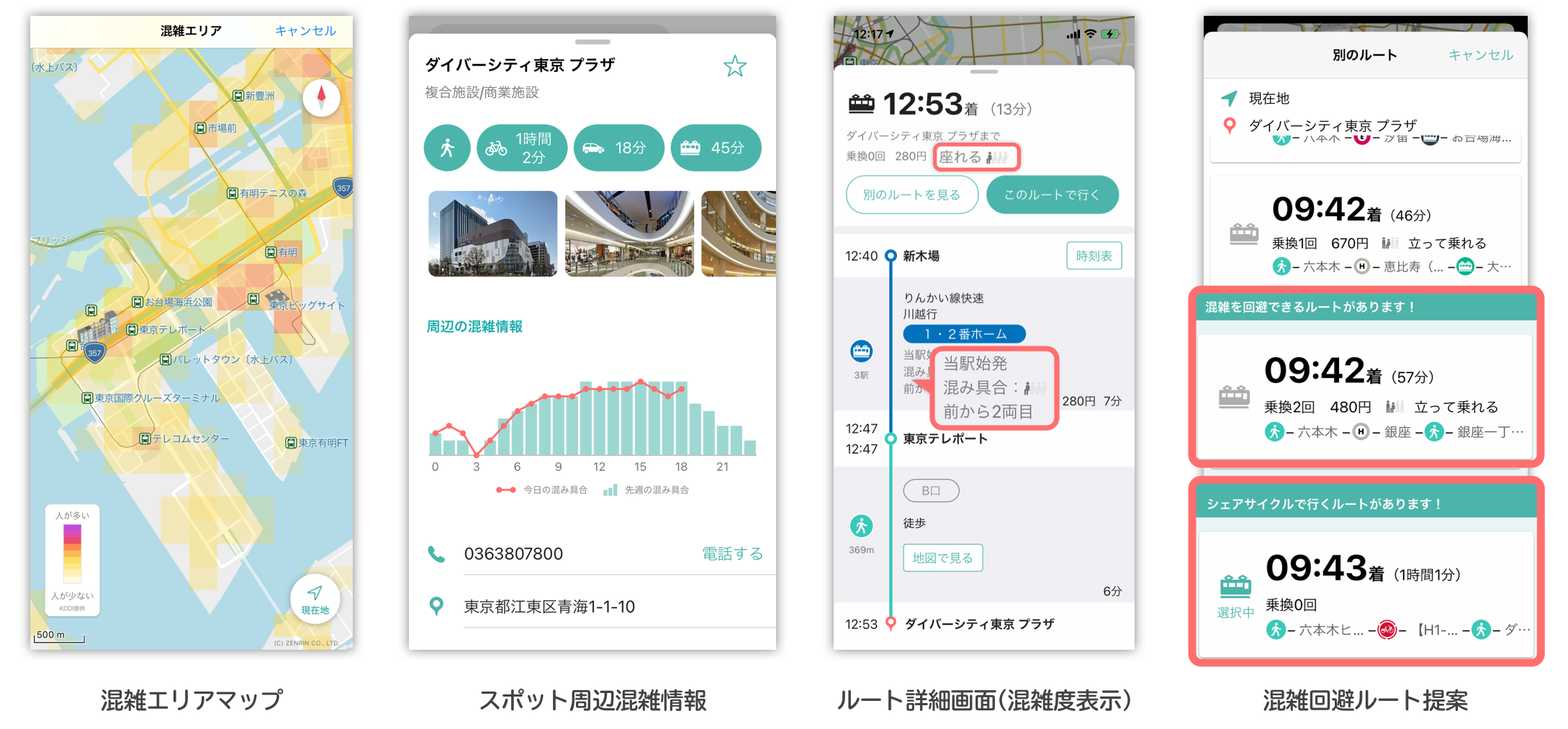さらに、「スポット周辺混雑情報」「混雑エリアマップ」「列車の混雑度表示」「混雑回避ルート」などの機能で混雑情報を可視化し、ご利用者自身で混雑するエリアや乗り物等を避け、空いている場所や時間を選択して、安全かつ快適に移動できるよう、サポートします。