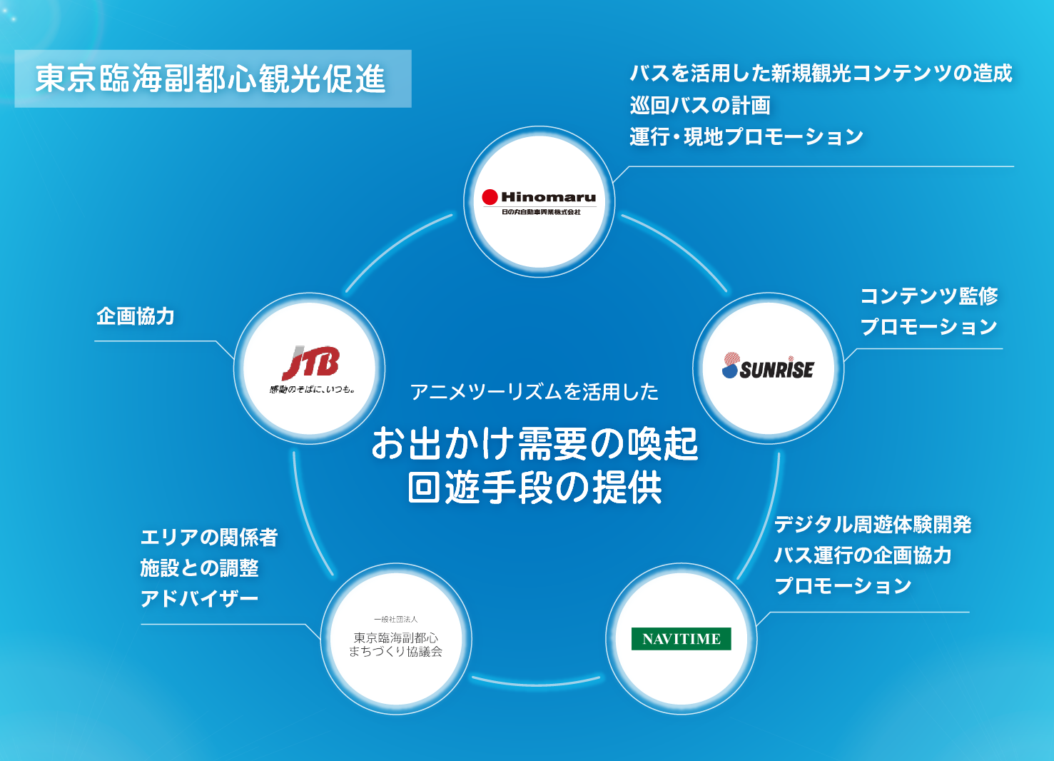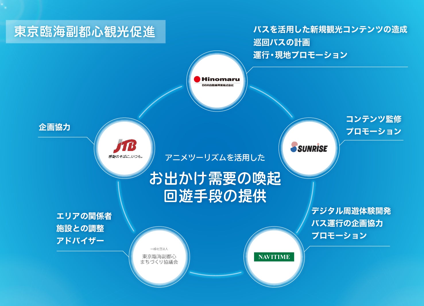 株式会社サンライズ(代表取締役社長:浅沼 誠、本社:東京都杉並区)、株式会社JTB(代表取締役社長:山北 栄二郎、本社:東京都品川区)、一般社団法人東京臨海副都心まちづくり協議会(理事長:日枝 久、事務局:東京都江東区)、株式会社ナビタイムジャパン(代表取締役社長:大西 啓介、本社:東京都港区)、日の丸自動車興業株式会社(代表取締役:富田 浩安、本社:東京都文京区)は、2022年1月22日(土)、23日(日)に、東京臨海副都心エリアにて、お台場にゆかりのあるTVアニメ「ラブライブ!虹ヶ咲学園スクールアイドル同好会」(以下、「ニジガク」)のモデル地を巡るオリジナルバスを運行し、モビリティを軸にアニメツーリズムを活用した誘客及び周遊促進の実証実験を行います。