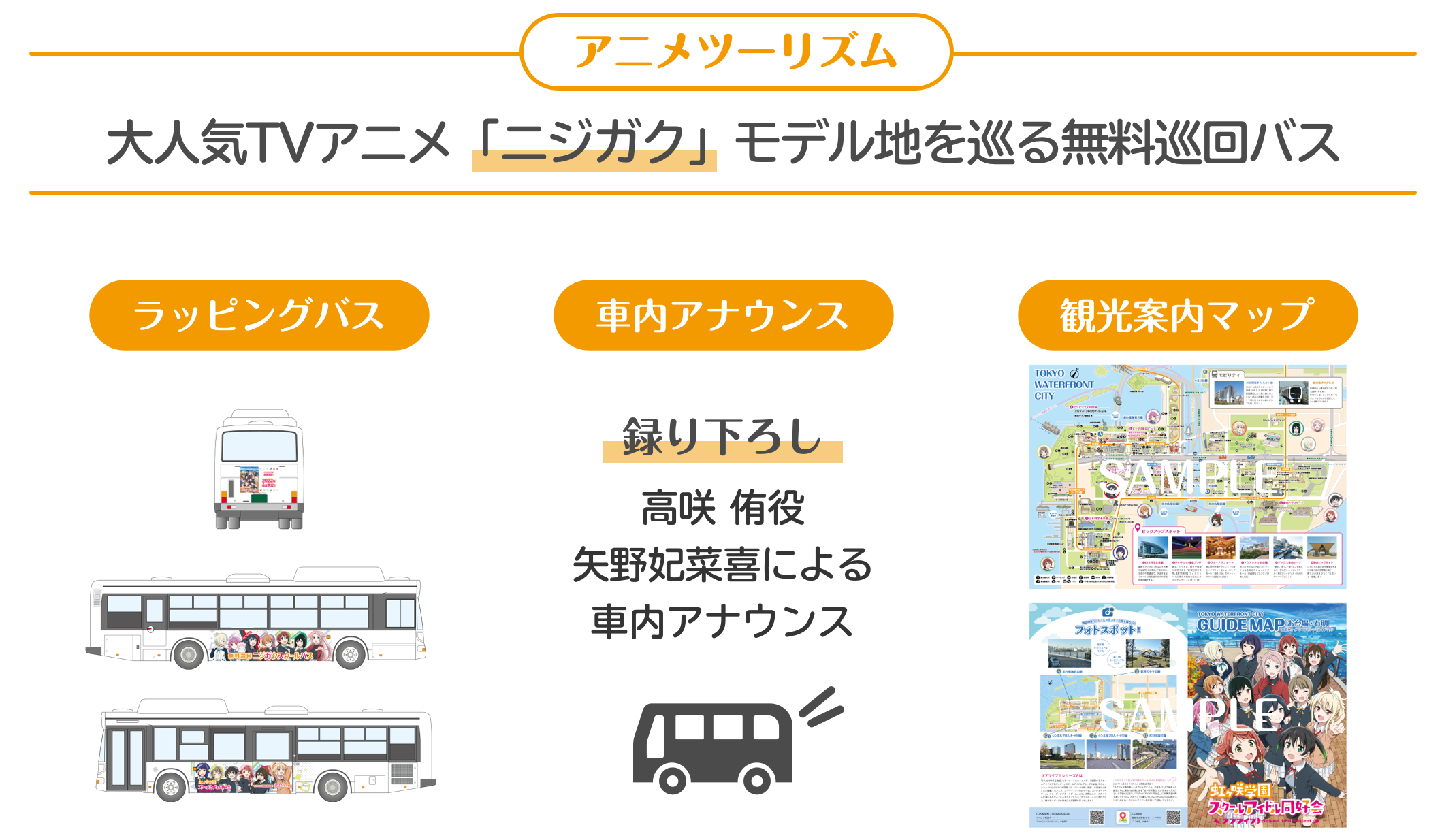 巡回バスは、本企画オリジナルの「ニジガク」ラッピングバスで、バスの車内アナウンスも「ニジガク」メンバーの声優による録り下ろしとすることで、臨海副都心エリアへの移動を喚起します。