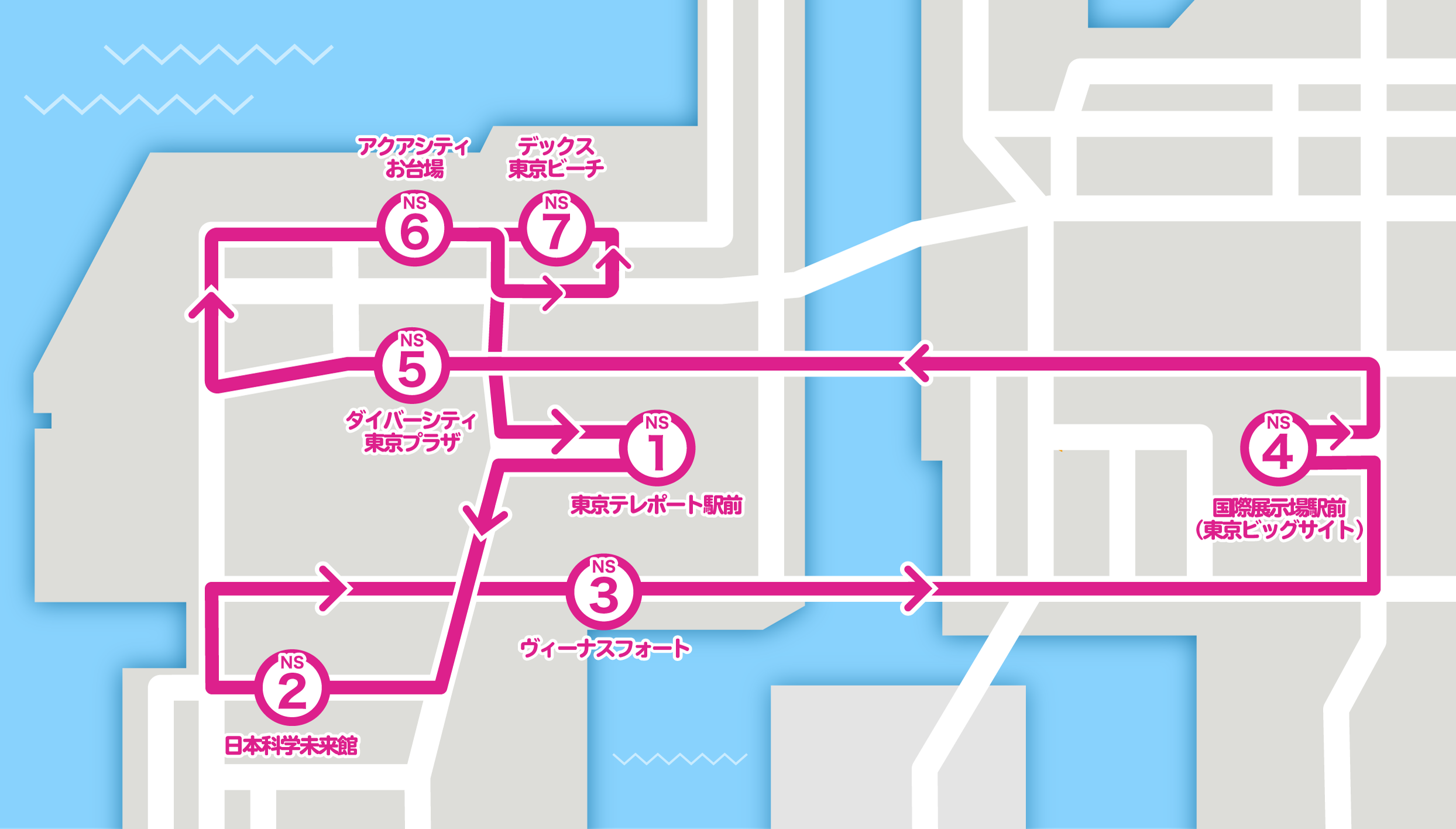 運行ルートの作成にあたっては、「ニジガク」で実際に登場した施設を中心に、エリアの事業者から長年要望があった台場・青海地区と有明地区をつないだ立ち寄りスポットを選定しました。回遊性の向上に寄与するとともに、中心エリアから離れたエリアへの送客効果も期待できるコースとなるように設計しています。