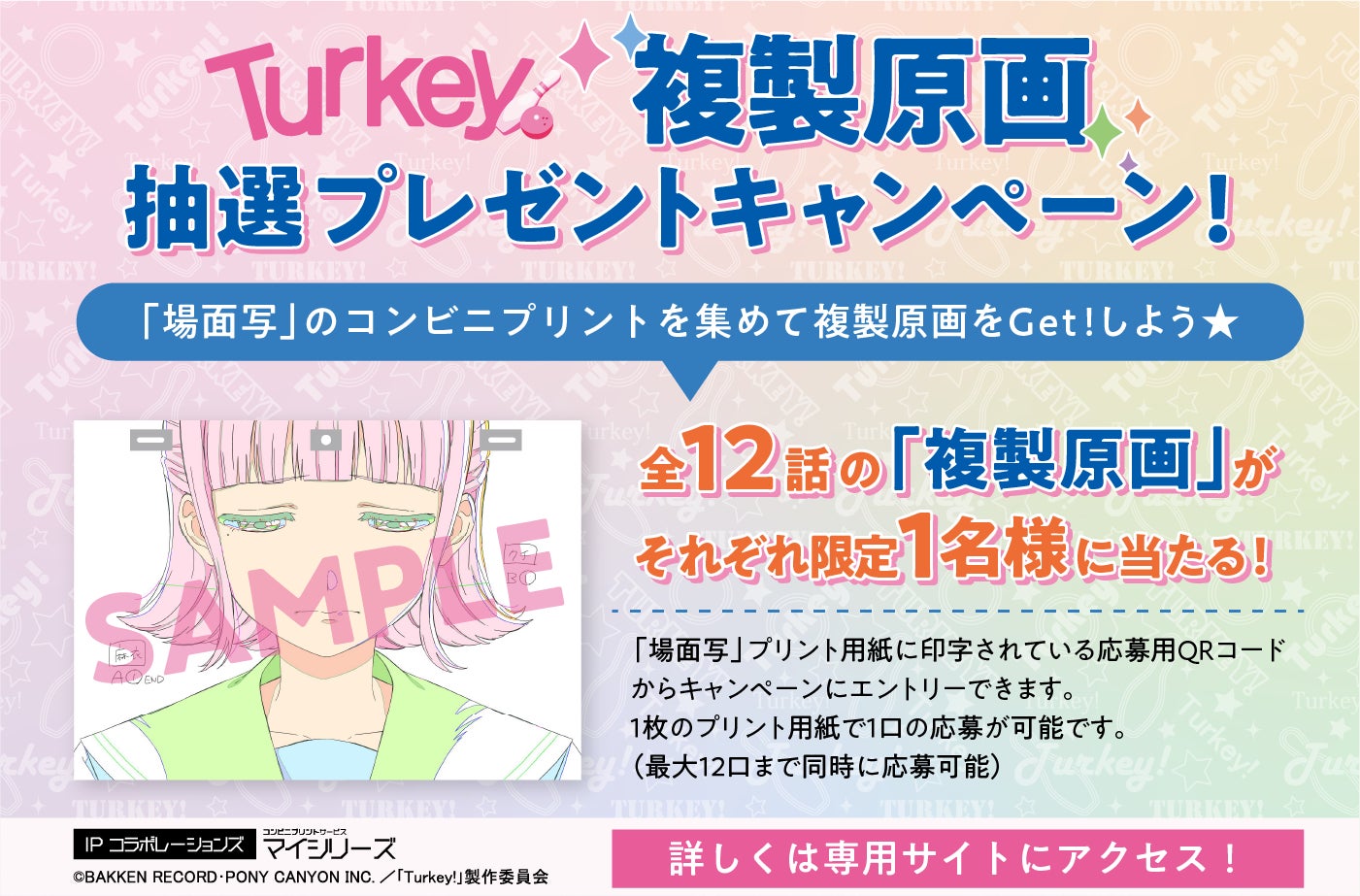 この『Turkey!』コンビニプリントでは、放送終了後の翌週(次話放送の前日)に各話より厳選された12点の「場面写」をL判写真用紙でプリントできる「場面写」、各キャラクターデザインの「シール」、「ポスター&ブロマイド」の3種類のプリントが楽しめます。