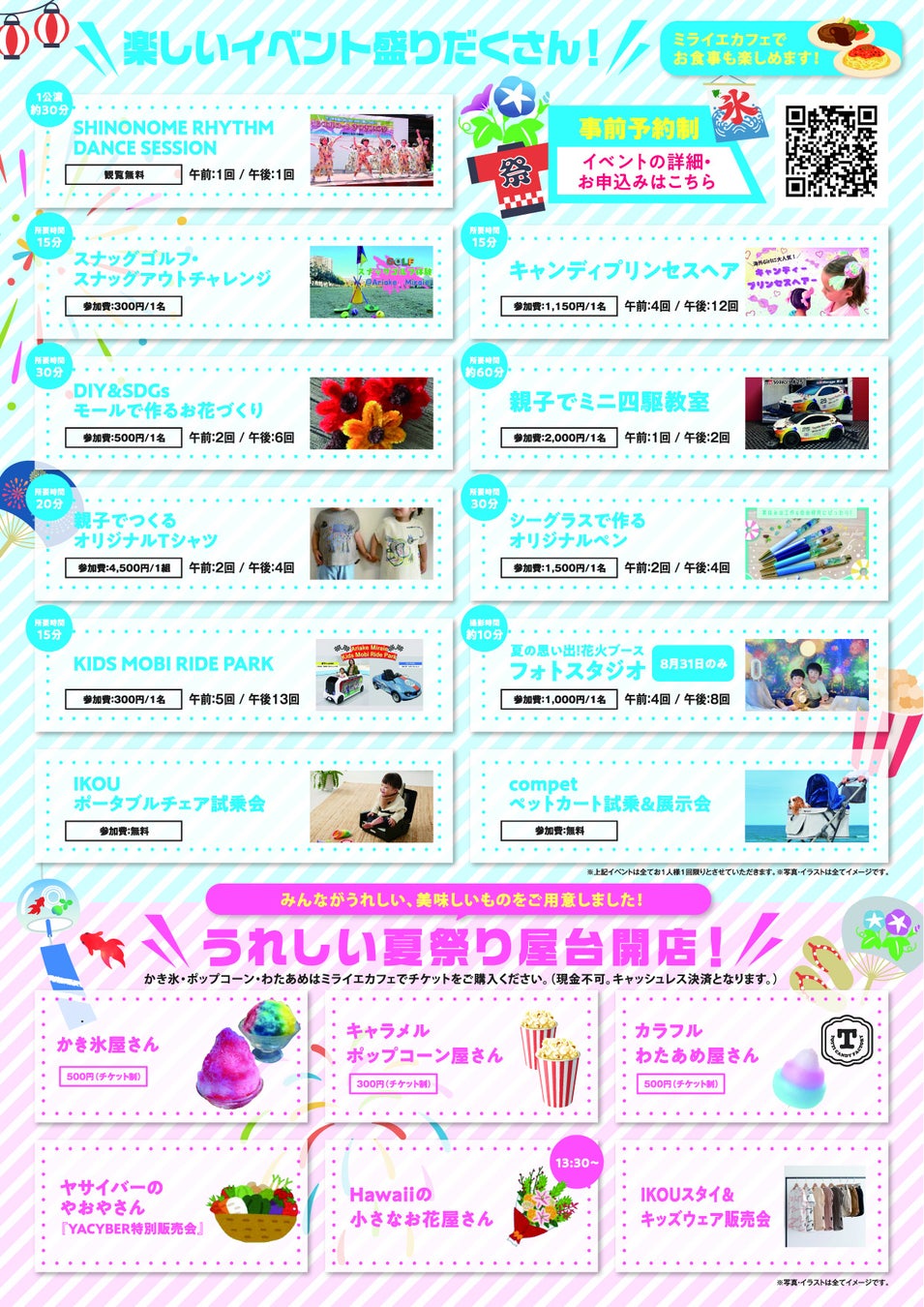 毎回好評のヘアアレンジを始め、オリジナルTシャツやシーグラスで作るオリジナルペン作り等、楽しめるイベントが盛りだくさんです。屋台には、かき氷やポップコーン、カラフルわたあめ等もあり、ご家族はもちろん、お友達同士でも楽しめるイベントとなっております。