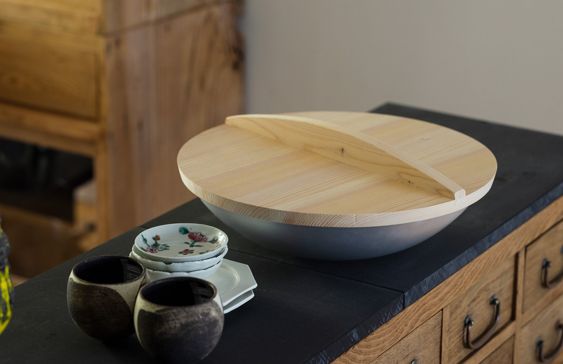 セットになったさわら木蓋を使ってお米を炊く、煮物や汁物を調理する。ビュッフェスタイルの料理やフルーツの盛りつけはもちろん、ジュエリーなどを乗せてオブジェのように使ったり、発想次第で用途は無限に広がります。
