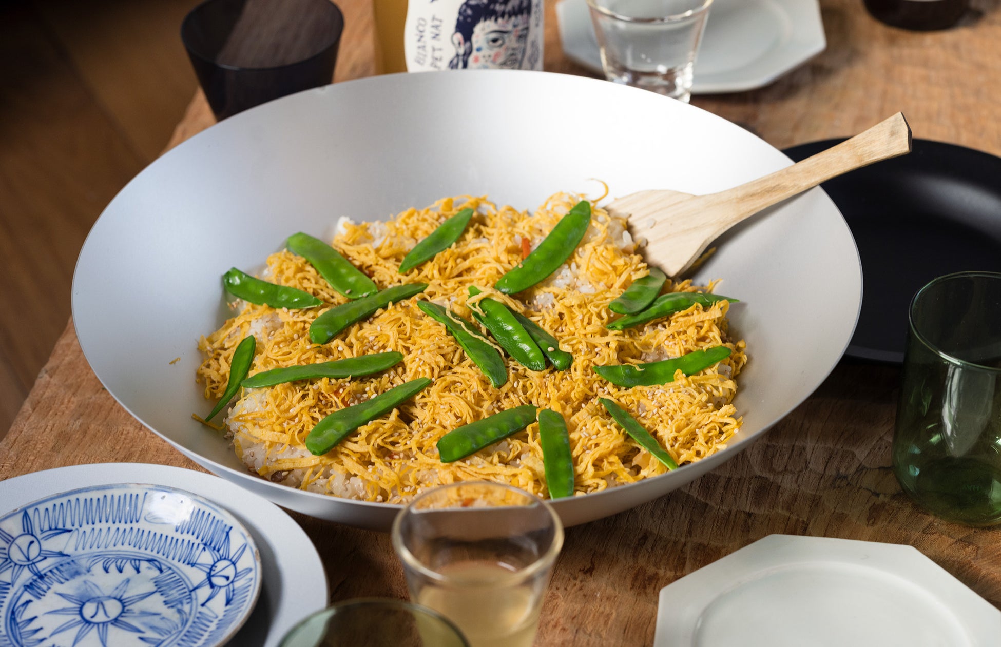 ちらし寿司などみんなで集まるパーティシーンに最適なダイナミックで、美しく、軽い直火可能なアルミ製の器φ330直火ワイドボウルを木蓋付きで発売いたします。