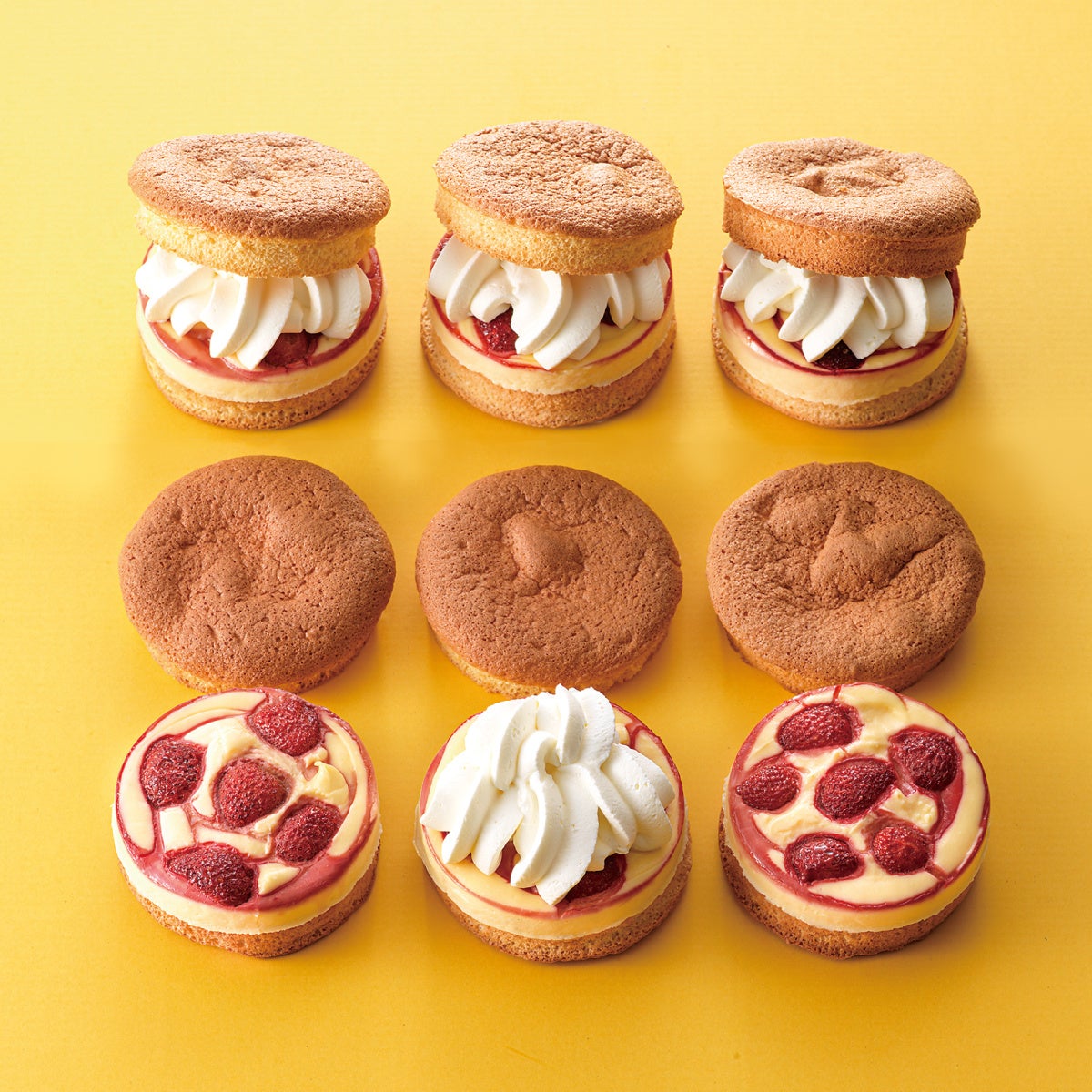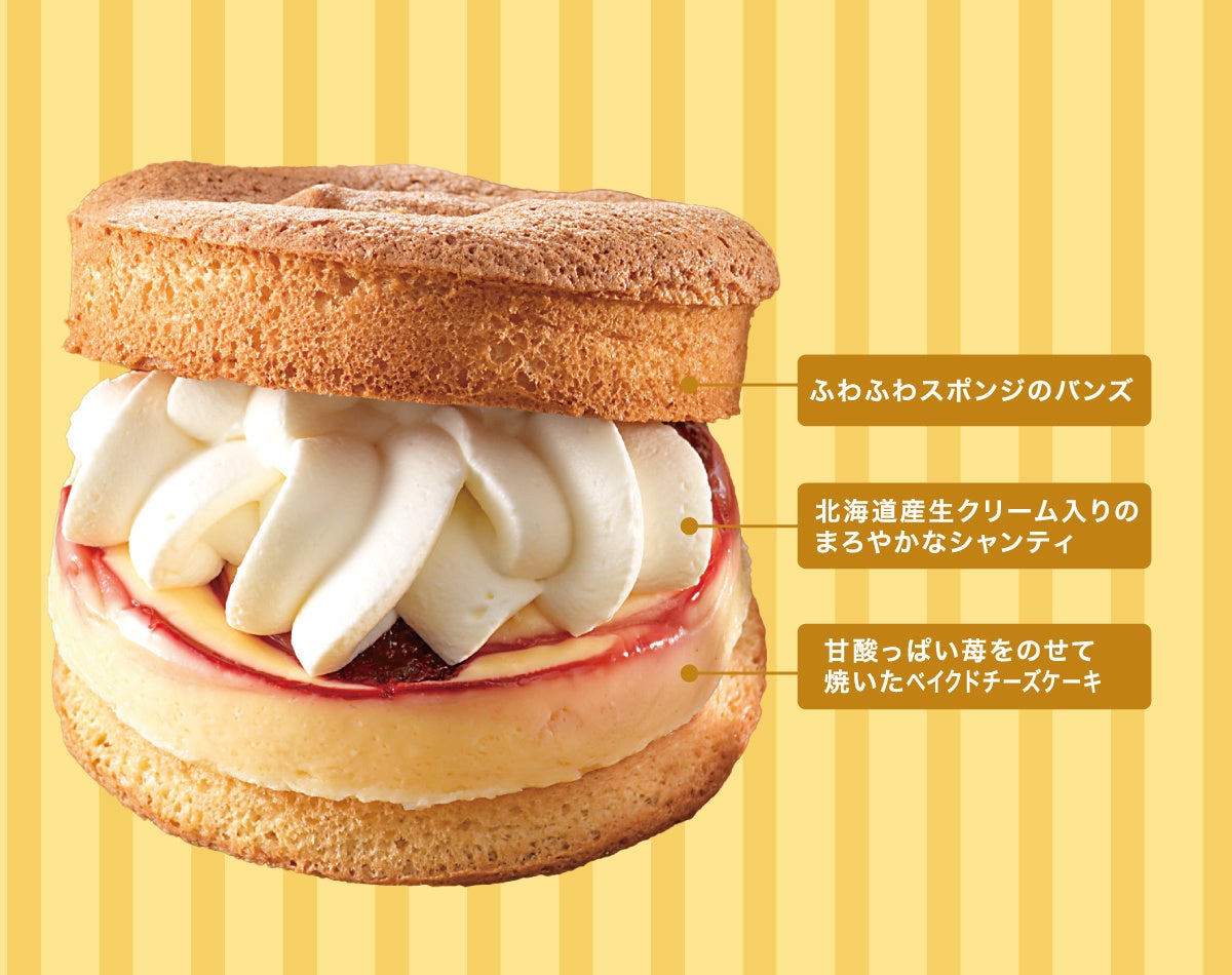 甘ずっぱい小ぶりのいちごをのせた濃厚なベイクドチーズケーキに北海道産生クリーム入りのシャンティをもりっと重ね、バンズに見立てたふわふわのスポンジで挟みました。