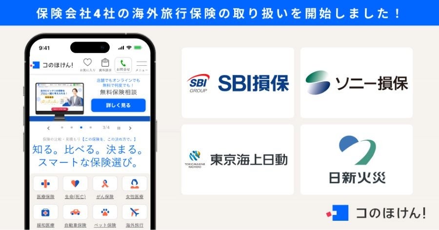 「コのほけん!」は、保険選びをオンラインで完結できるデジタル保険代理店です。 保険の見積り・比較・検討・申込まですべてをデジタル化し「自分に合った保険を、自分で選べる世界」を実現します。コのほけん!は直感的に操作しやすく、イラストやインフォグラフィックスを取り入れることで、複雑で分かりづらいと思われがちな保険商品を見やすく、分かりやすく掲載しています。また、口コミや専門家のコメントが充実しておりインターネットがあれば時と場所を選ばず、保険を検討することができます。
