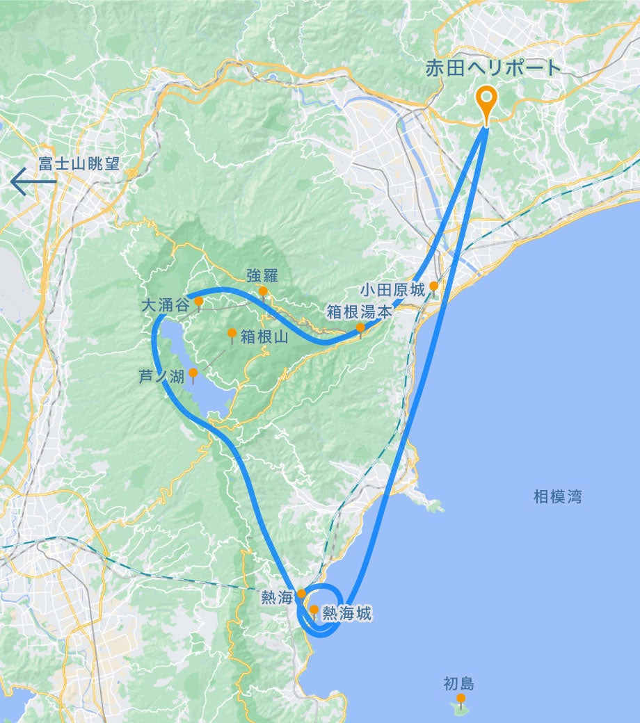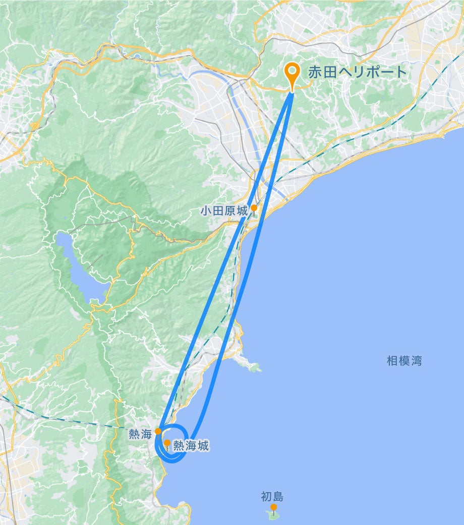 熱海城・小田原城コース | 25分 | 64,900円 | 熱海城、小田原城など相模湾近郊の城下町をヘリ遊覧します。 |