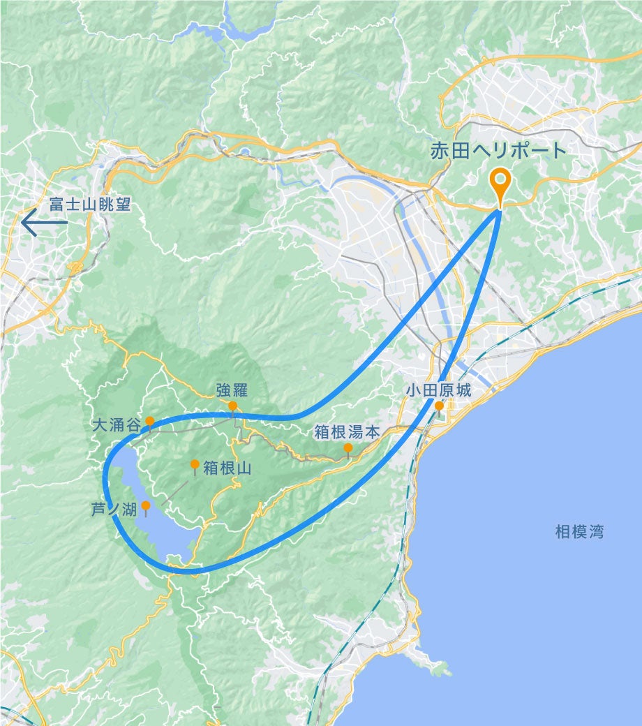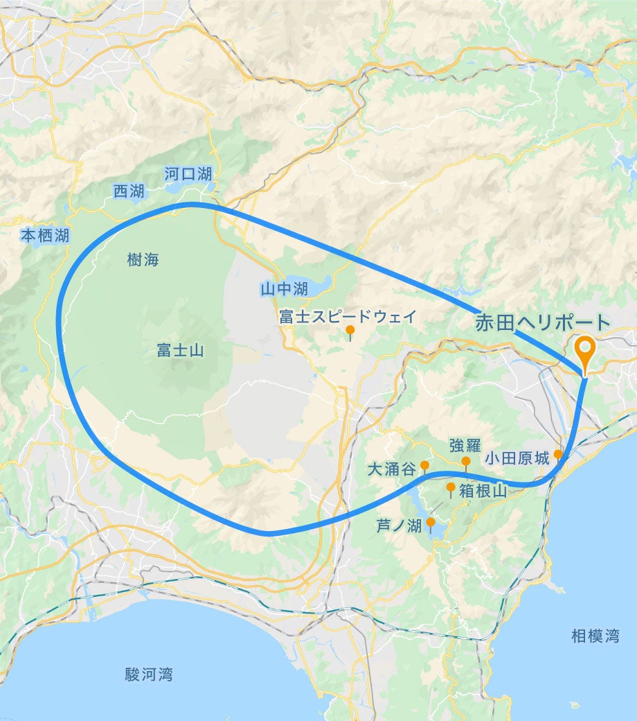 芦ノ湖・大涌谷コース | 25分 | 64,900円 | 芦ノ湖・大涌谷といった箱根エリアを上空から観光します。 |