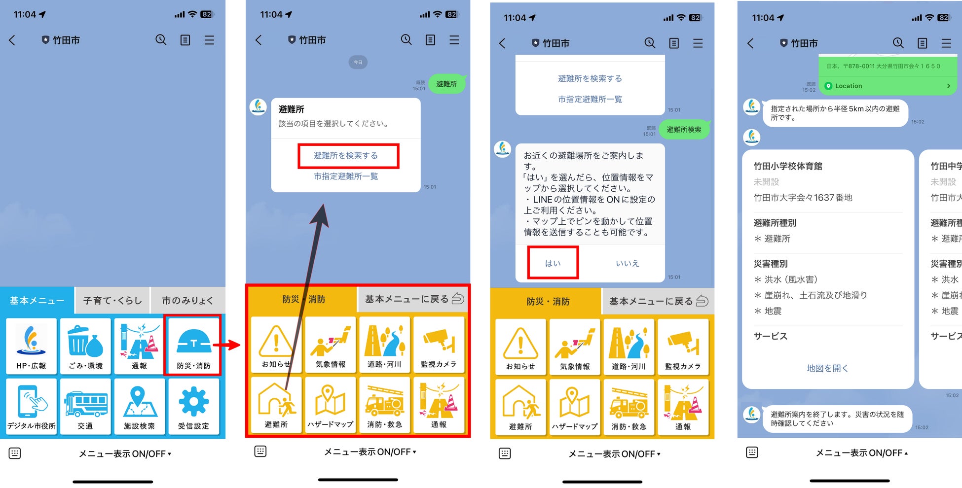 「避難所検索機能」は、チャットボットの案内に従って自身の位置情報をLINEに送信することで、近くの避難所施設を案内する機能です。普段から近くの避難所を確認しておくことができ、万が一災害が発生した際は検索した避難所の開設状況を知ることが可能です。