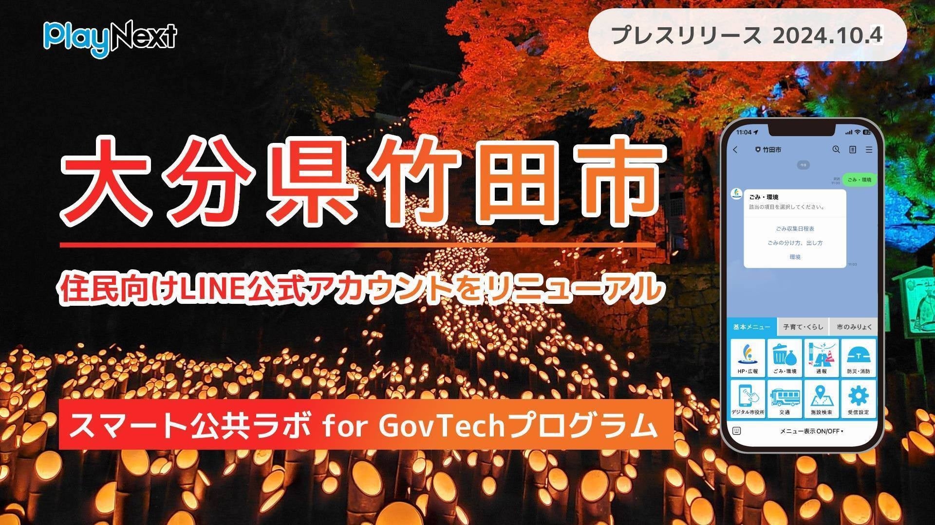 プレイネクストラボ株式会社(本社:東京都品川区、代表取締役:柏 匠、以下 「プレイネクストラボ」)の提供する「スマート公共ラボ for GovTechプログラム」が、大分県竹田市(以下「竹田市」)のLINE公式アカウントに採用され、2024年10月4日(金)より一般公開したことをお知らせします。