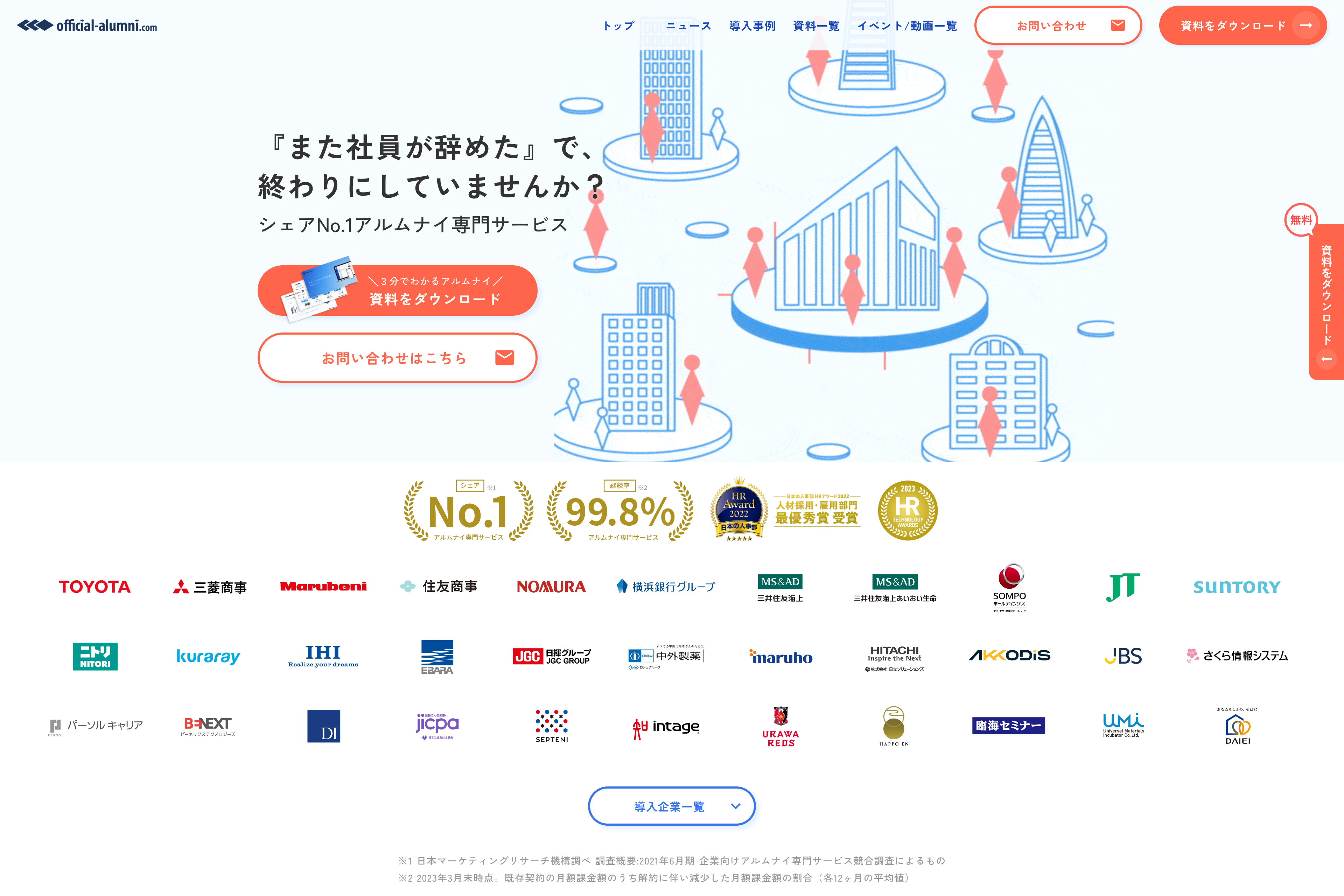 *日本マーケティングリサーチ機構調べ 調査概要:2021年6月期 企業向けアルムナイ専門サービス競合調査によるもの