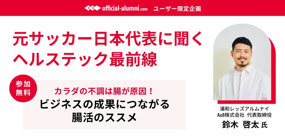元サッカー日本代表としても知られる浦和レッズアルムナイで現在はAuB株式会社代表取締役を務める鈴木啓太氏をお招きし、ビジネスパーソンの慢性的な不調を引き起こす原因とAuB社が提唱する正しい腸活についてなどをお話しいただきます。