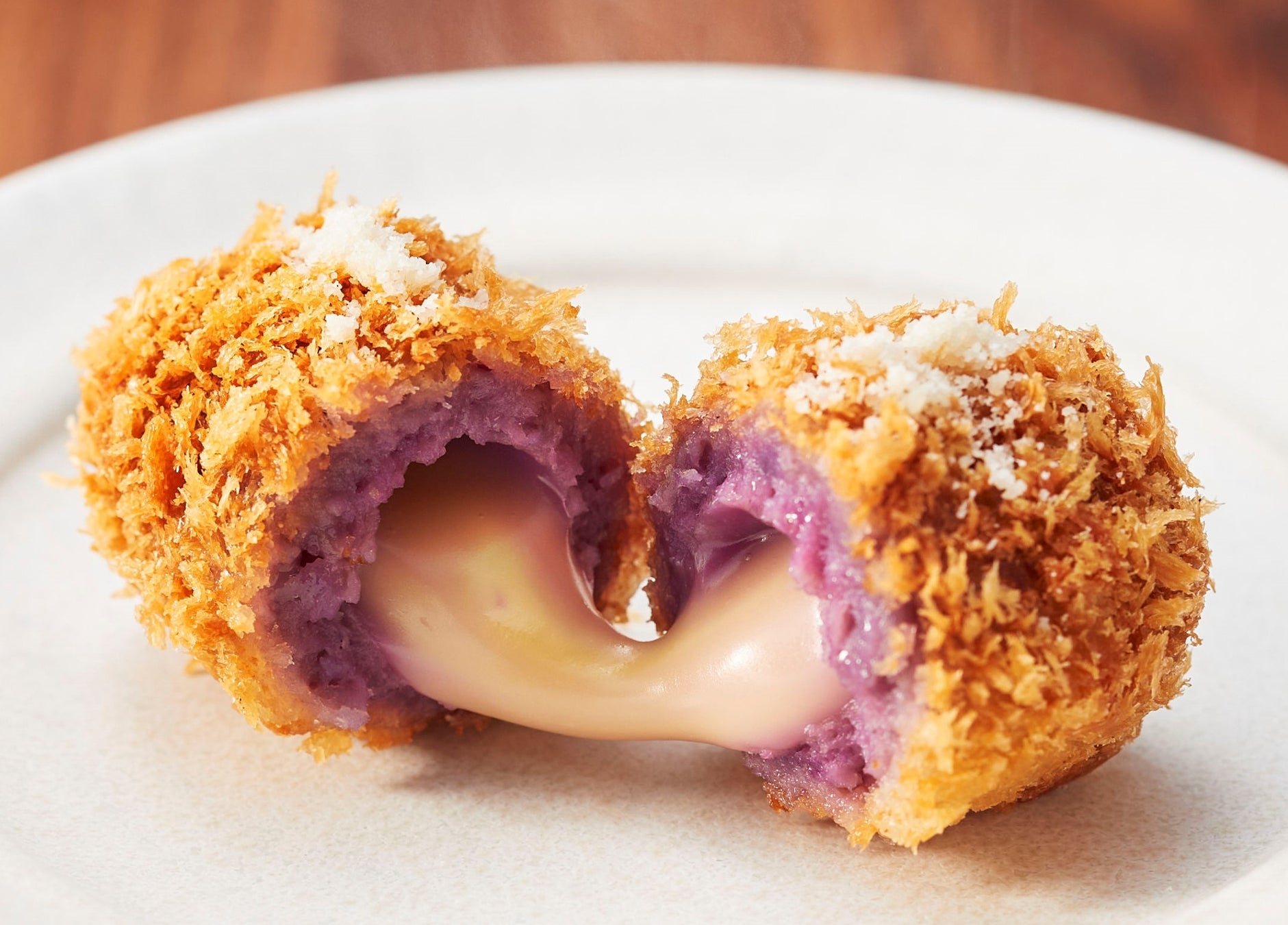 この時期限定で、紫色のじゃがいも“シャドークイーン”を使用。中のチーズはゴーダ、グリュイエール、モッツァレラ、パルミジャーノレッジャーノをミックスし、お子様から大人まで食べやすい味わいに。