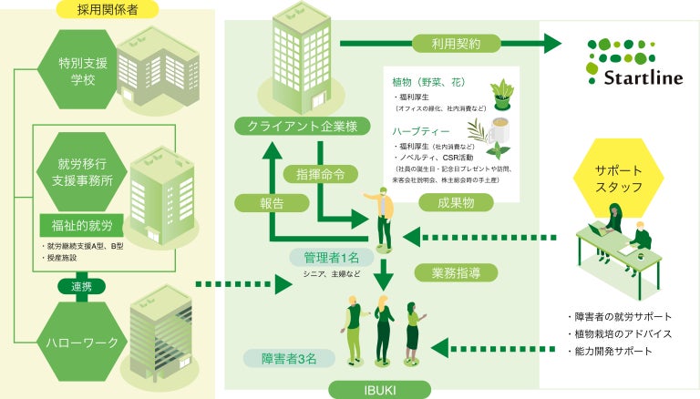 IBUKIは天候の影響を受けにくい屋内型農園を活用した、障害者雇用の仕組みをワンストップで提供するサービスです。