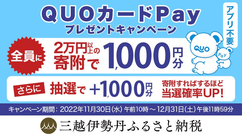 キャンペーン期間中に『三越伊勢丹ふるさと納税』にて合計20,000円以上の寄附をした方全員に、QUOカードPay1,000円分をプレゼントします。さらに抽選で10名様に1人に+1,000円分が当たります。寄附すればするほど当選確率がアップするキャンペーンです。
