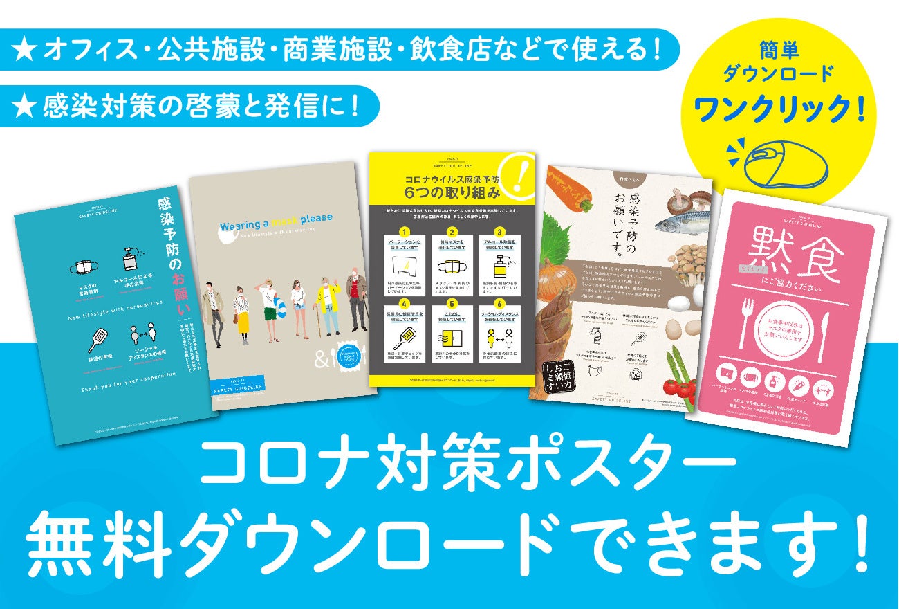 完全特注のオリジナルグッズの企画生産、およびウイルス対策グッズメーカー事業を手がけるアイグッズ株式会社(本社:東京都渋谷区)はこのたび、厚生労働省・経済産業省などの発信をもとに作成した感染症対策啓蒙ポスターを、ワンクリックで無料ダウンロードできるサイトをオープン。カテゴリーを「一般用」「飲食店用」「その他」と3つに分けて幅広くラインアップしていますので、感染対策の「発信」と「啓蒙」にぜひご活用ください。