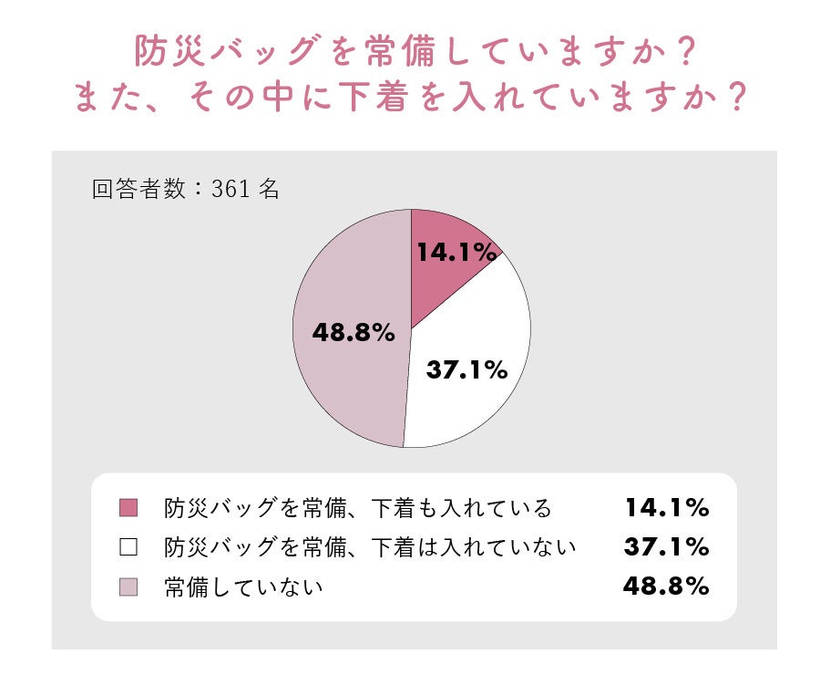弊社メルマガ会員など361名へのアンケート調査を実施。約半数の方が「防災バッグを常備していない」と回答。避難生活の備えとして下着を準備していない方は、全体の85%以上にも上ることがわかりました。