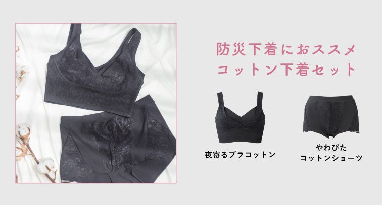 防災用の下着として持っておくと安心な、肌にやさしい綿混素材のナイトブラと、伸縮性がよく履き心地の快適なショーツのセット。このセットには以下のような特徴があります。