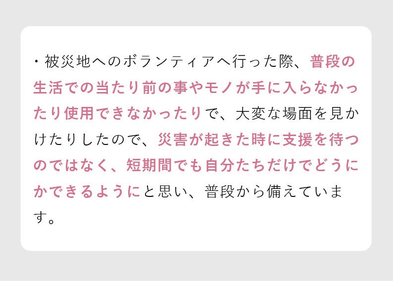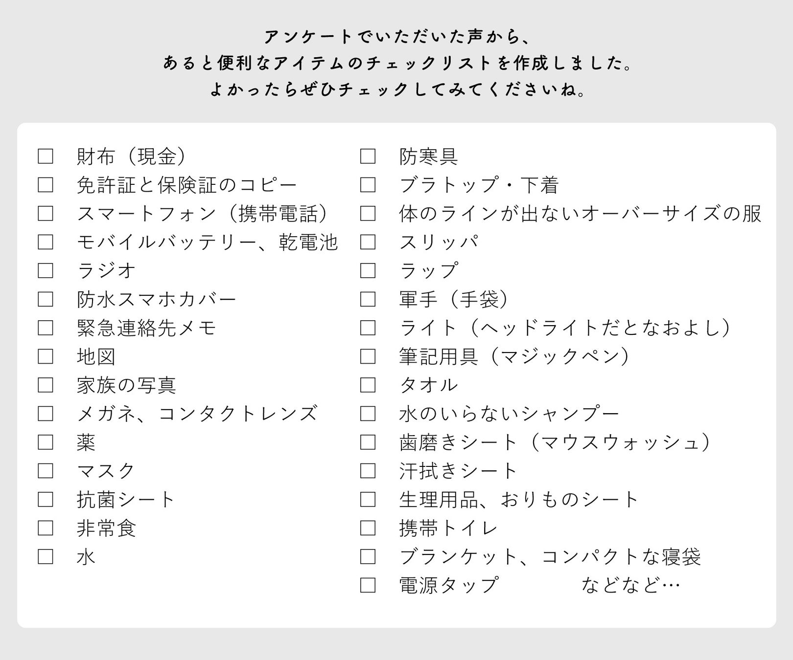 - 防災バッグに入れているもの、被災した時に役に立ったアイテムリストも作成。