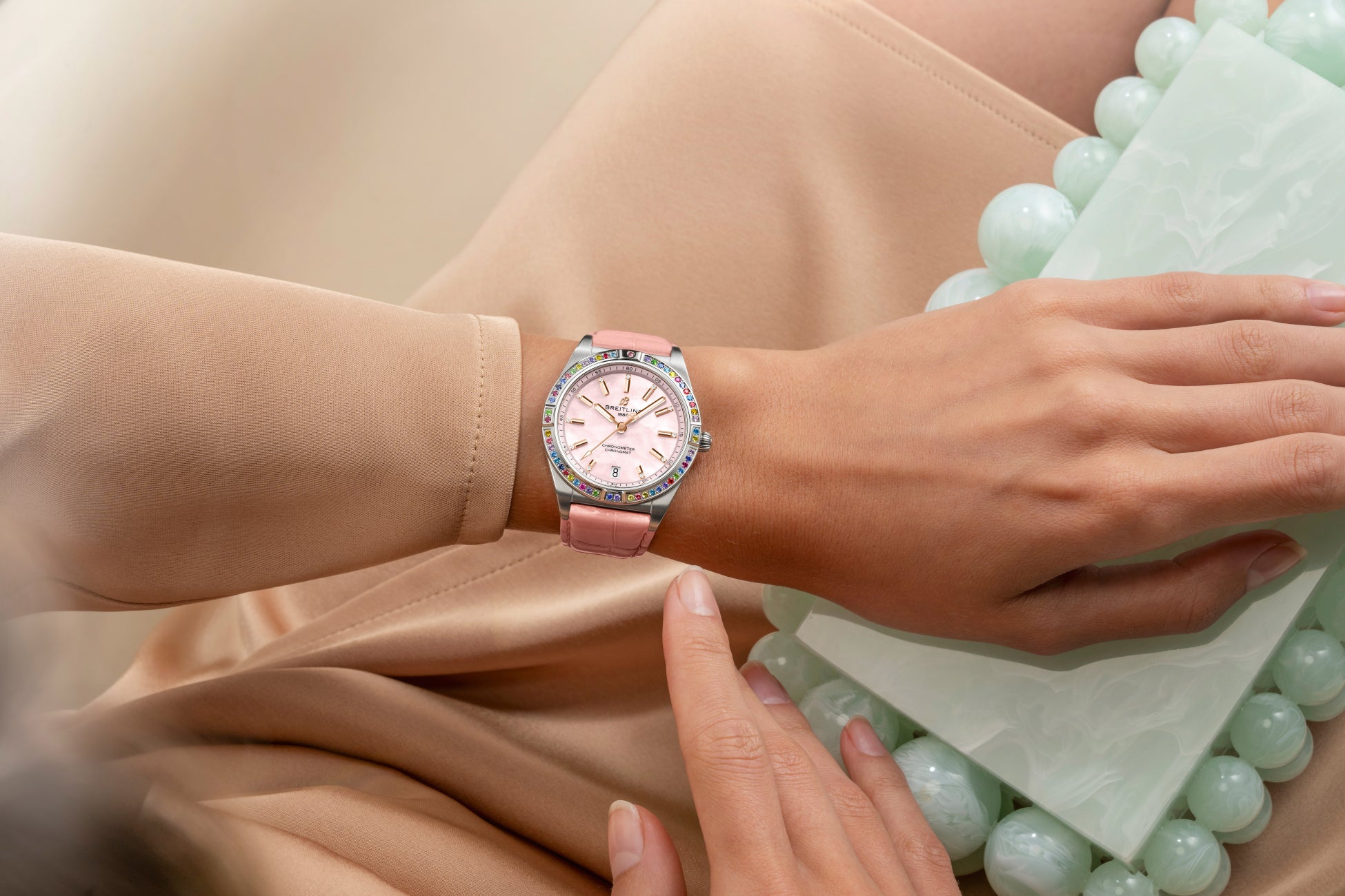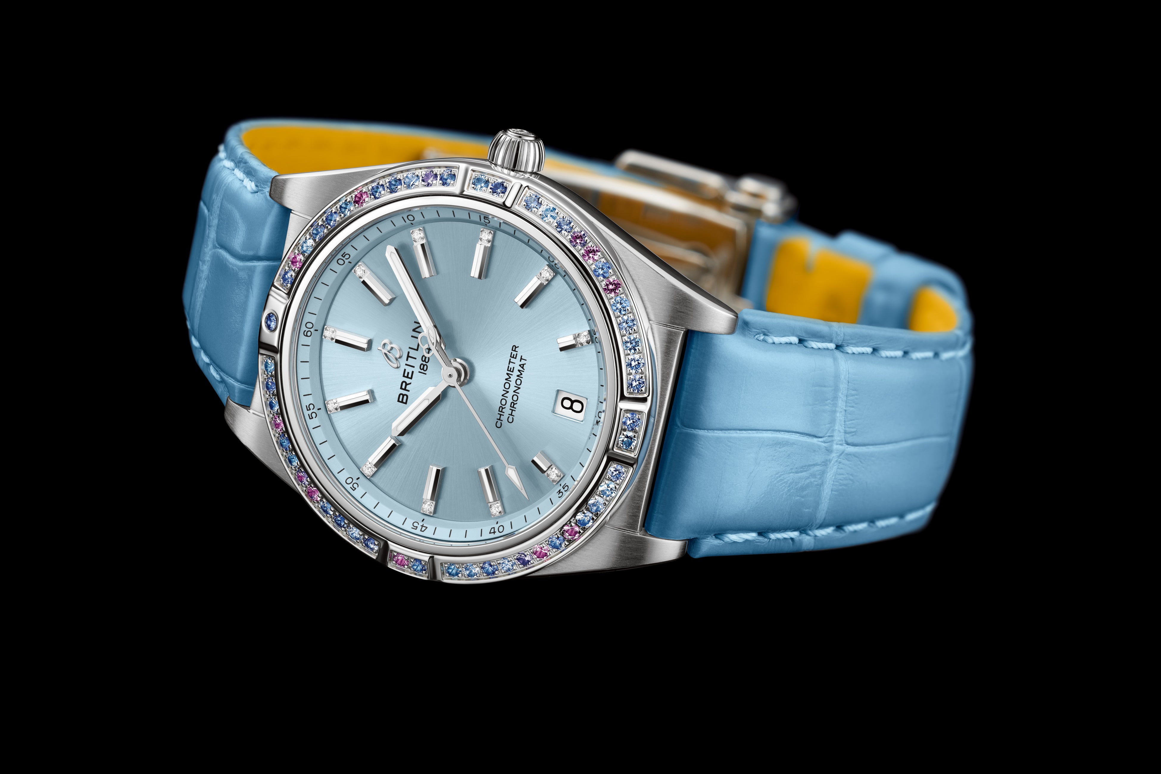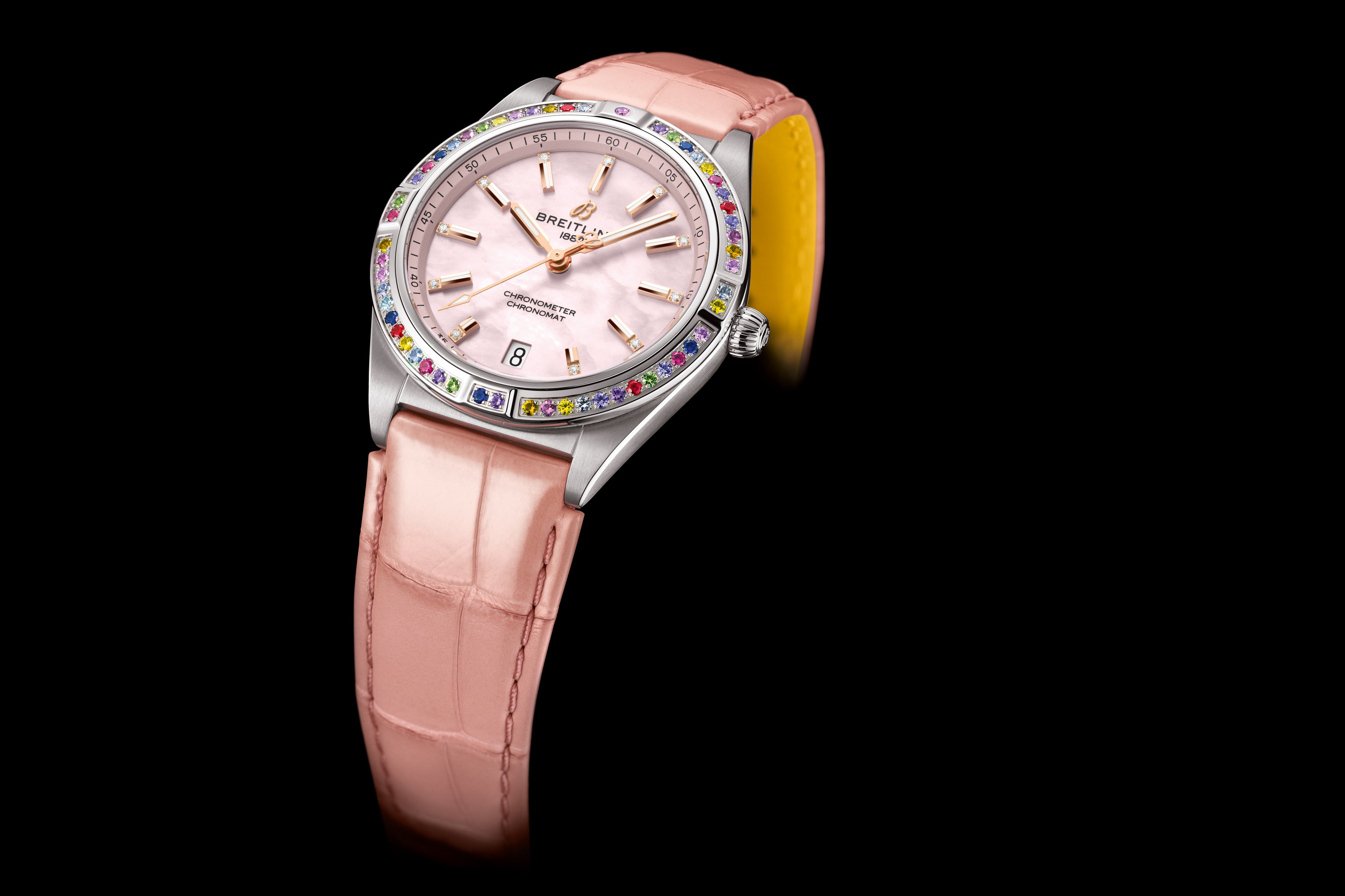 新作はアイスブルー、グリーンのメタリックダイヤルと、ピンクのマザーオブパールのダイヤルの展開。いずれもダイヤモンドをセットしたインデックス、多彩な宝石をあしらったベゼルが特徴。ダイヤルと色を合わせたアリゲーターレザーストラップ、またはブライトリング独自のルーローブレスレットからお選びいただけます。