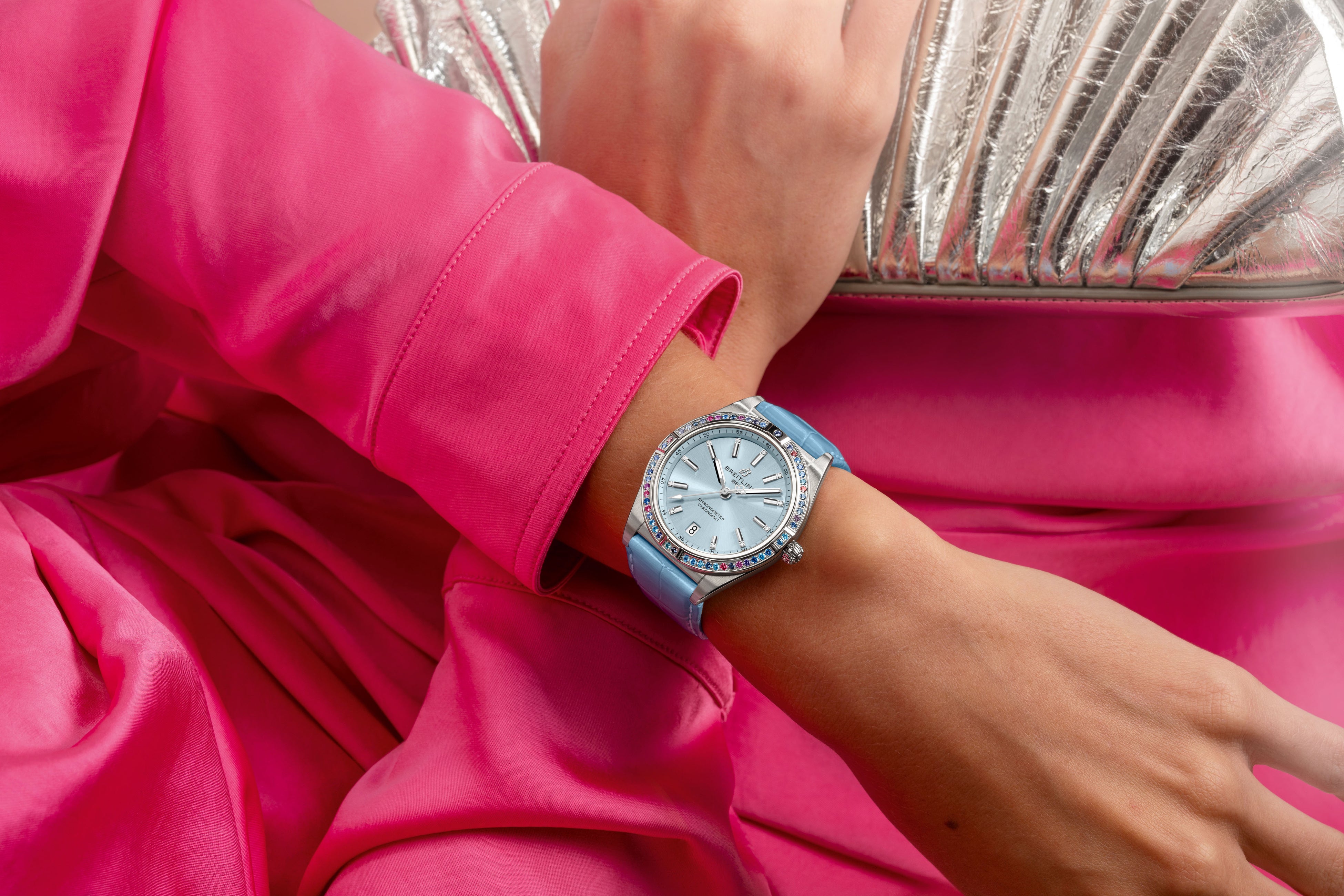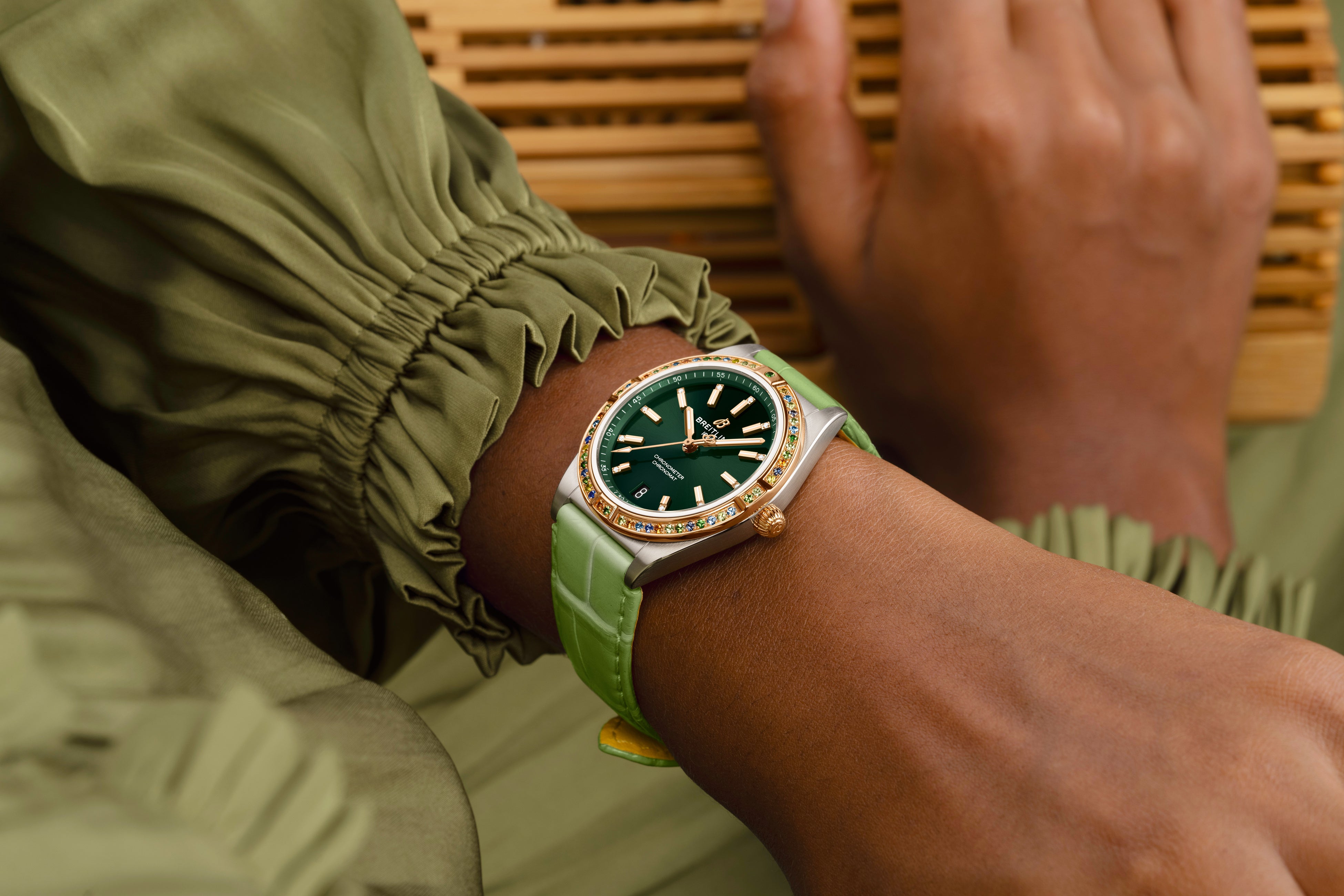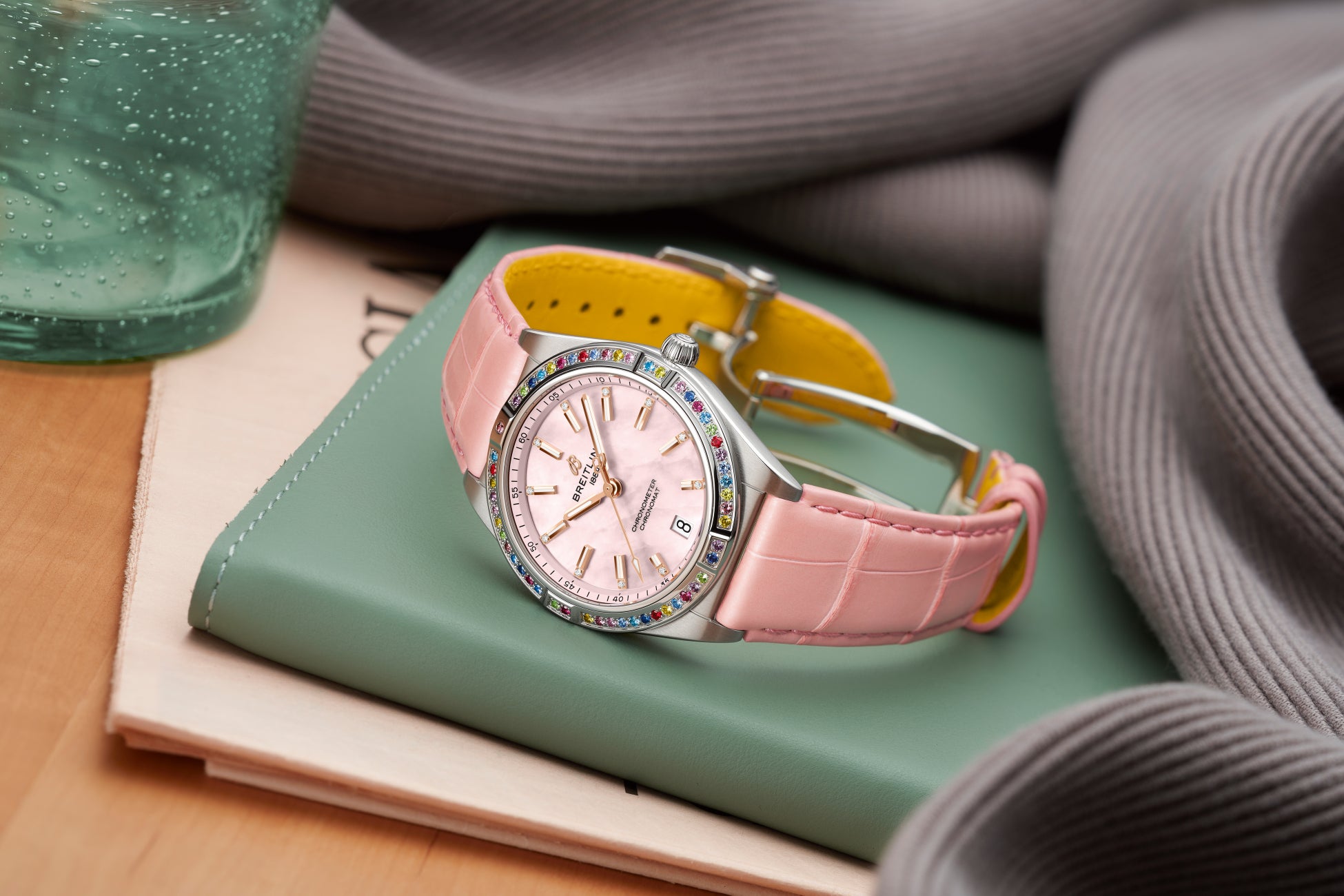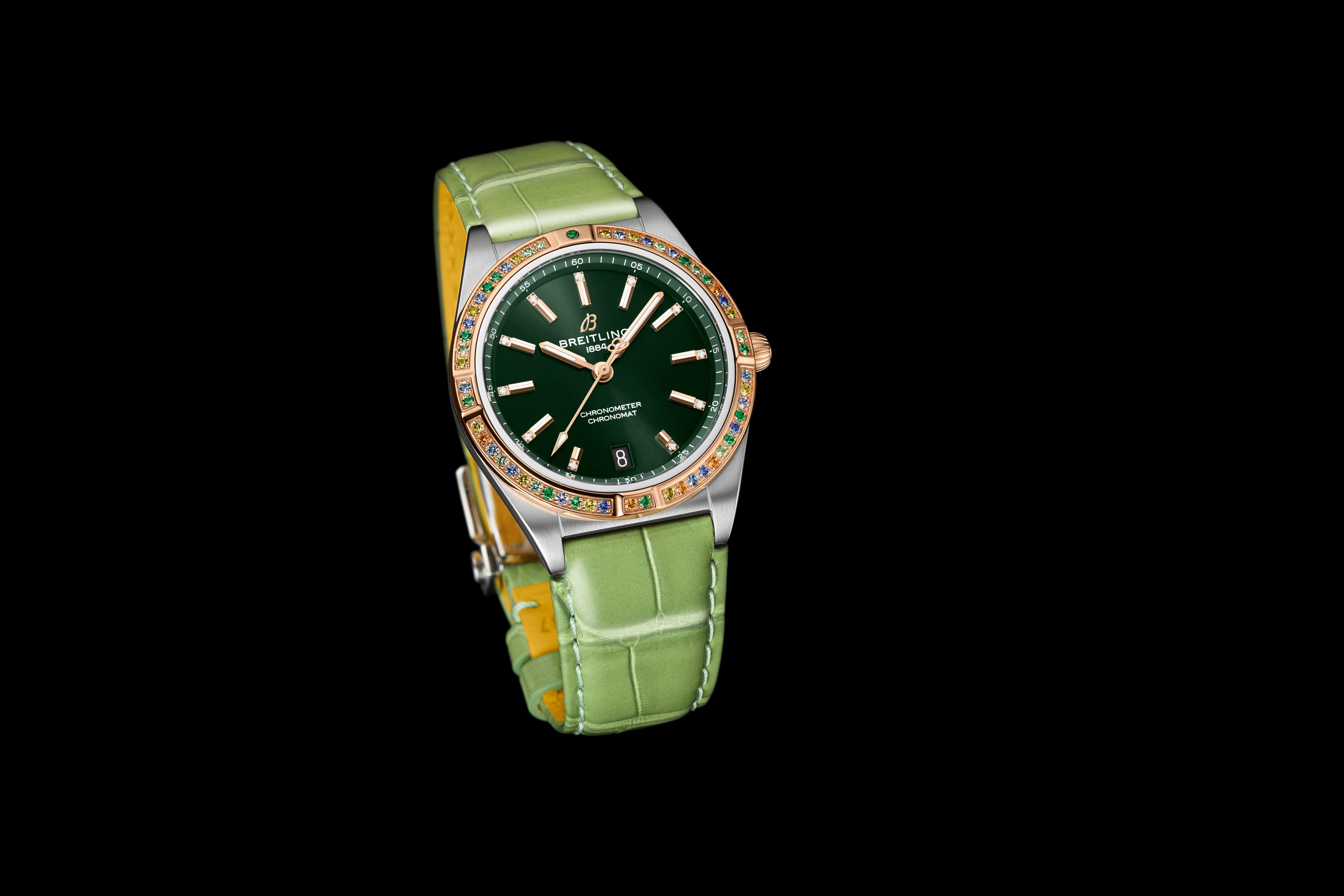 新作はアイスブルー、グリーンのメタリックダイヤルと、ピンクのマザーオブパールのダイヤルの展開。いずれもダイヤモンドをセットしたインデックス、多彩な宝石をあしらったベゼルが特徴。ダイヤルと色を合わせたアリゲーターレザーストラップ、またはブライトリング独自のルーローブレスレットからお選びいただけます。
