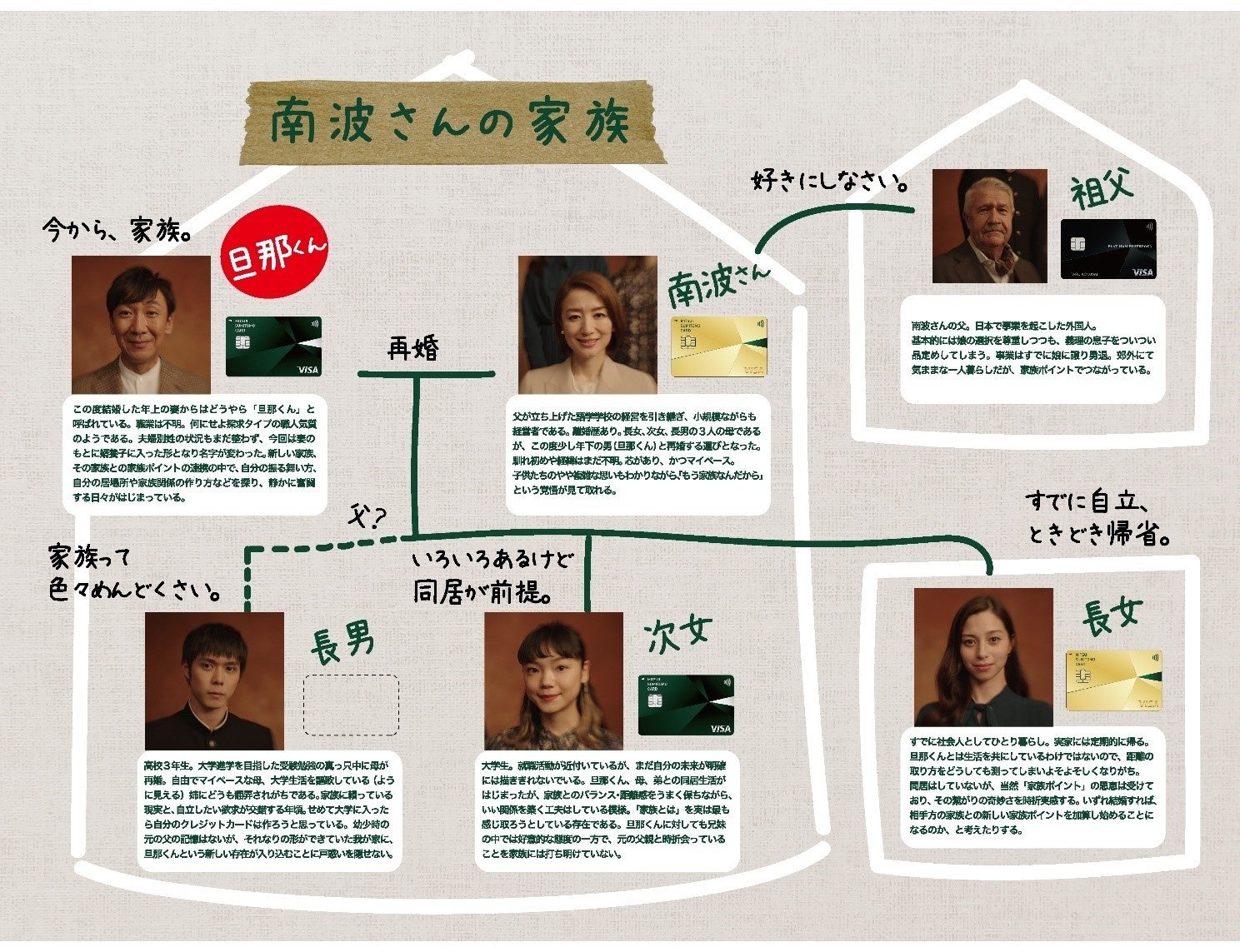 新サービスが「家族ポイント」というストレートなネーミングを持つことから、あえて設定に奇をてらわず、家族の多様性とリアリティーを盛り込みながら“南波家”のユニークな日常をお届けします。