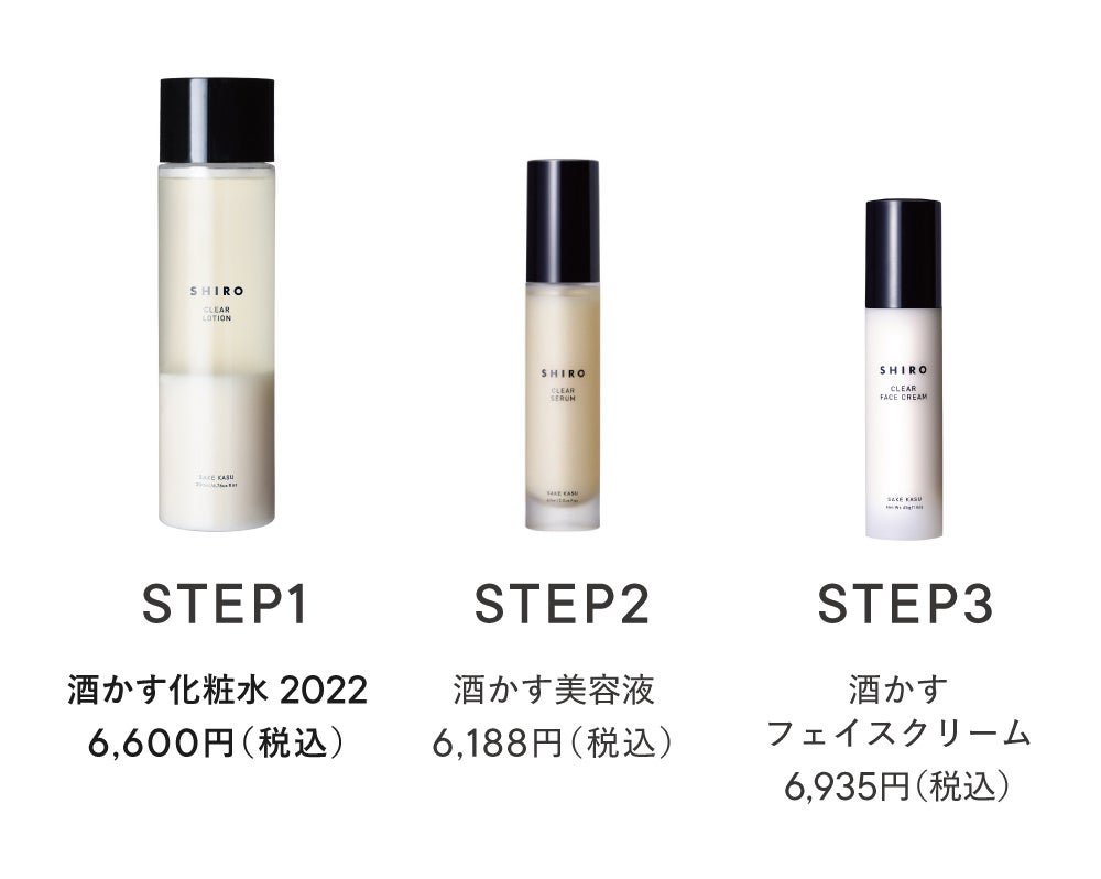 甘くやさしい香りに包まれながら、酒かす*1のパワーを補給し、紫外線によって受けたダメージや乾燥によるくすみにもアプローチ。吸い付くような潤いを与え、透明感のある肌へと導く3ステップです。