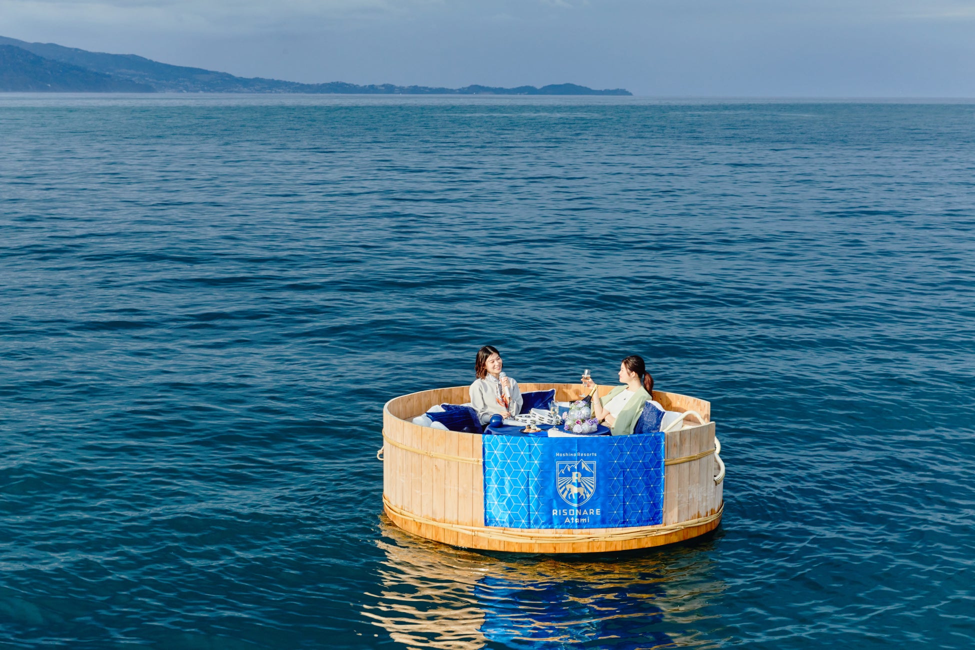 「カラ桶」は、当ホテルから車で約 20 分の場所に位置する南熱海と呼ばれるエリアの海に登場します。熱海の街並みを横目に、遠く続く相模湾を一望できる開放的な場所です。「カラ桶」は温泉地・熱海にちなみ桶をモチーフにしており、直径2.5メートルの円形ボートをヒノキなどで装飾しています。桶内にはカラオケ機器が設置されており、プライベートな空間でカラオケを楽しむことができます。