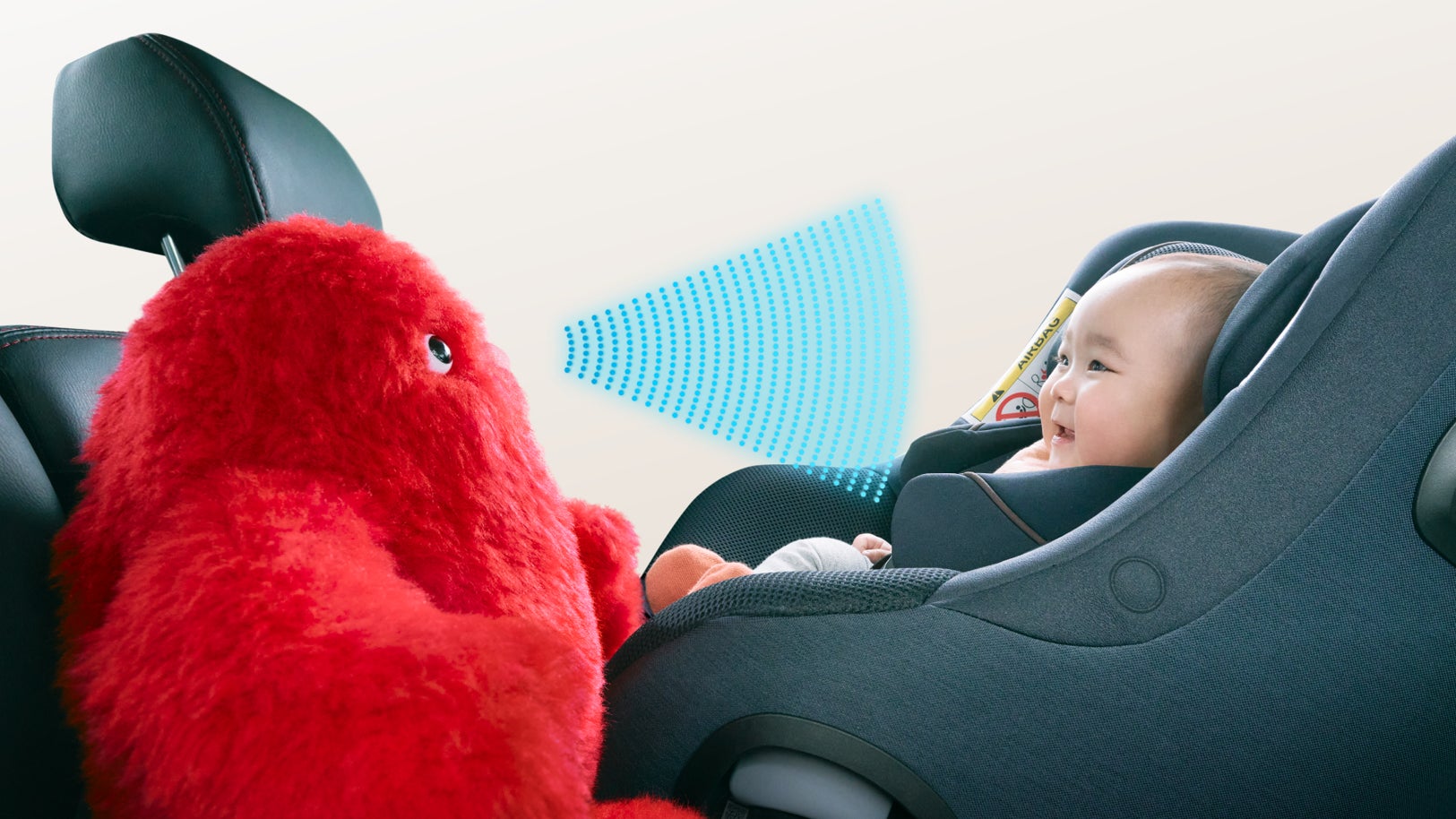 イルヨがチャイルドシートに座る赤ちゃんの表情の変化をカメラで検知。赤ちゃんの目の開閉を感知することでベビー イルヨも目を開閉。運転席のドライバーに、赤ちゃんが寝ているか起きているかを知らせます。