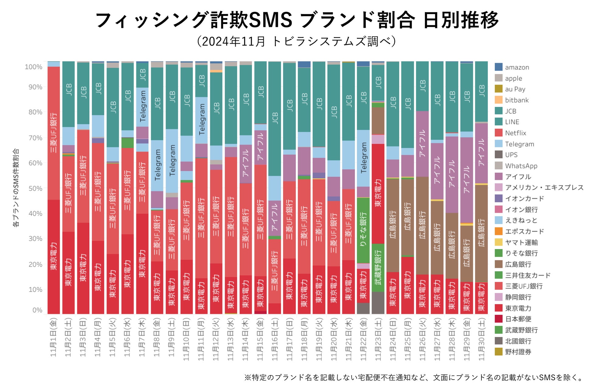 2024年11月は銀行やクレジットカード会社など、金融機関のブランド名を悪用したSMSが発生しました。「三菱UFJ銀行」や「JCB」をかたるSMSが多発したほか、11月24日〜30日にかけては「広島銀行」をかたるSMSが集中的に発生しました。また、消費者金融の「アイフル」をかたるSMSも発生しました。