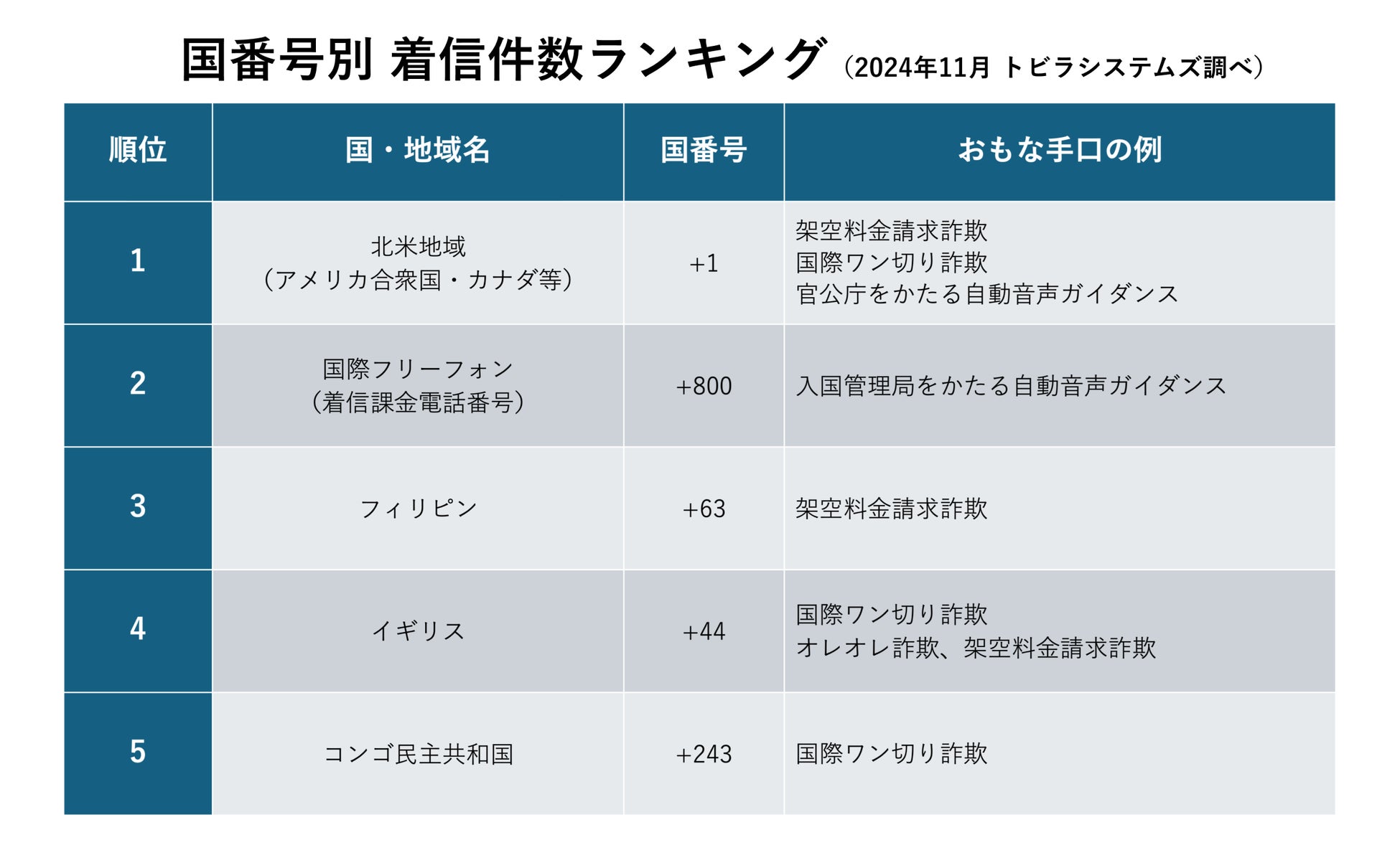 当社の調査で、2024年11月に着信件数が多かった国際電話の国番号は、上位からアメリカ合衆国やカナダなどの北米地域、国際フリーフォン(注1)、フィリピン、イギリス、コンゴ民主共和国でした。