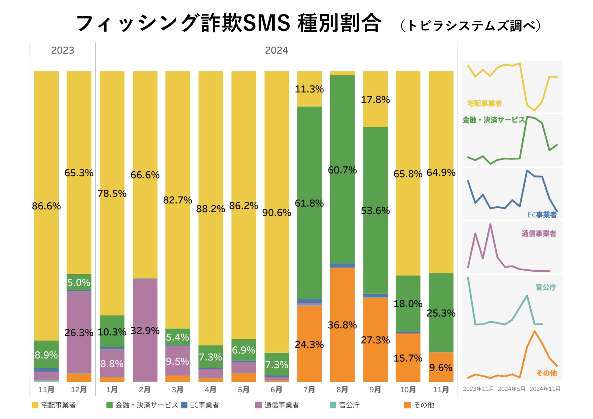 トビラシステムズの調査で、2024年11月に確認されたフィッシング詐欺のSMSの種別割合は、前月に続き宅配事業者をかたる手口が最多の64.9%となりました。金融・決済サービスをかたる手口は前月より増加し25.3%、その他の事業者をかたる手口は9.6%となりました。
