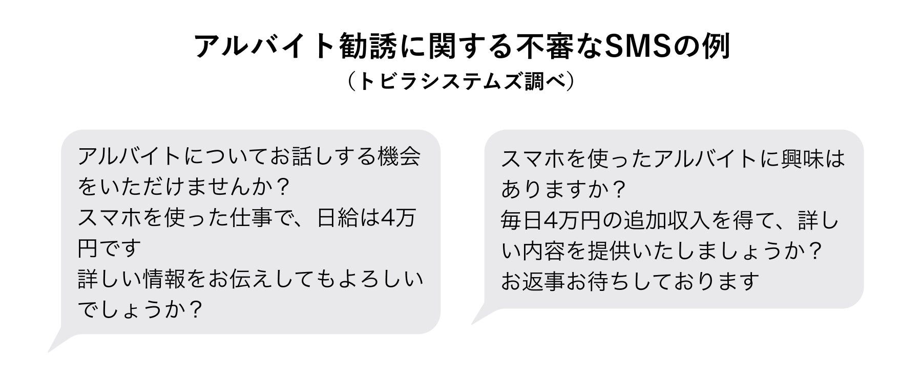 アルバイトの勧誘に関する不審なSMSが多発しています。トビラシステムズの調査では、11月から12月にかけて「スマホを使った仕事」「日給4万円」などと記載された不審なSMSの急増が確認されています。