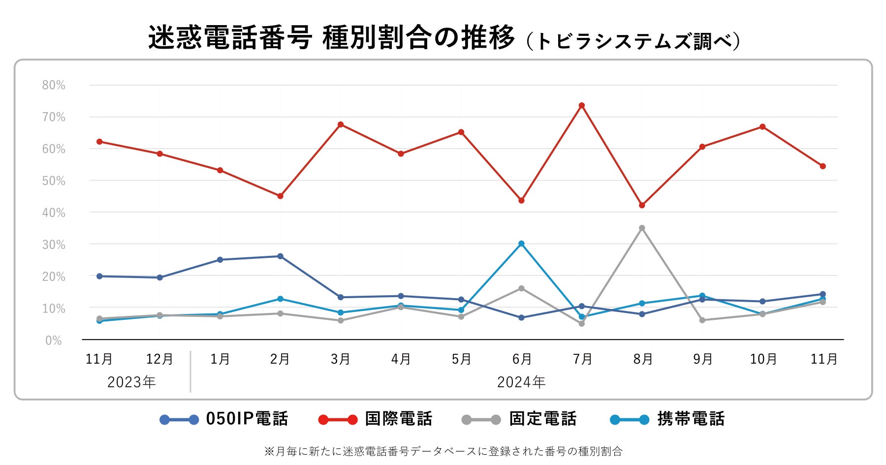 2024年11月に新たにトビラシステムズの迷惑電話番号データベースに登録された番号の種別割合は、国際電話番号が54.5%(前月比−12.4%)で前月から減少したものの、全体では依然高水準で推移しています。特定IP電話番号(050番号)、固定電話番号、携帯電話番号の割合は横ばい傾向で推移しています。