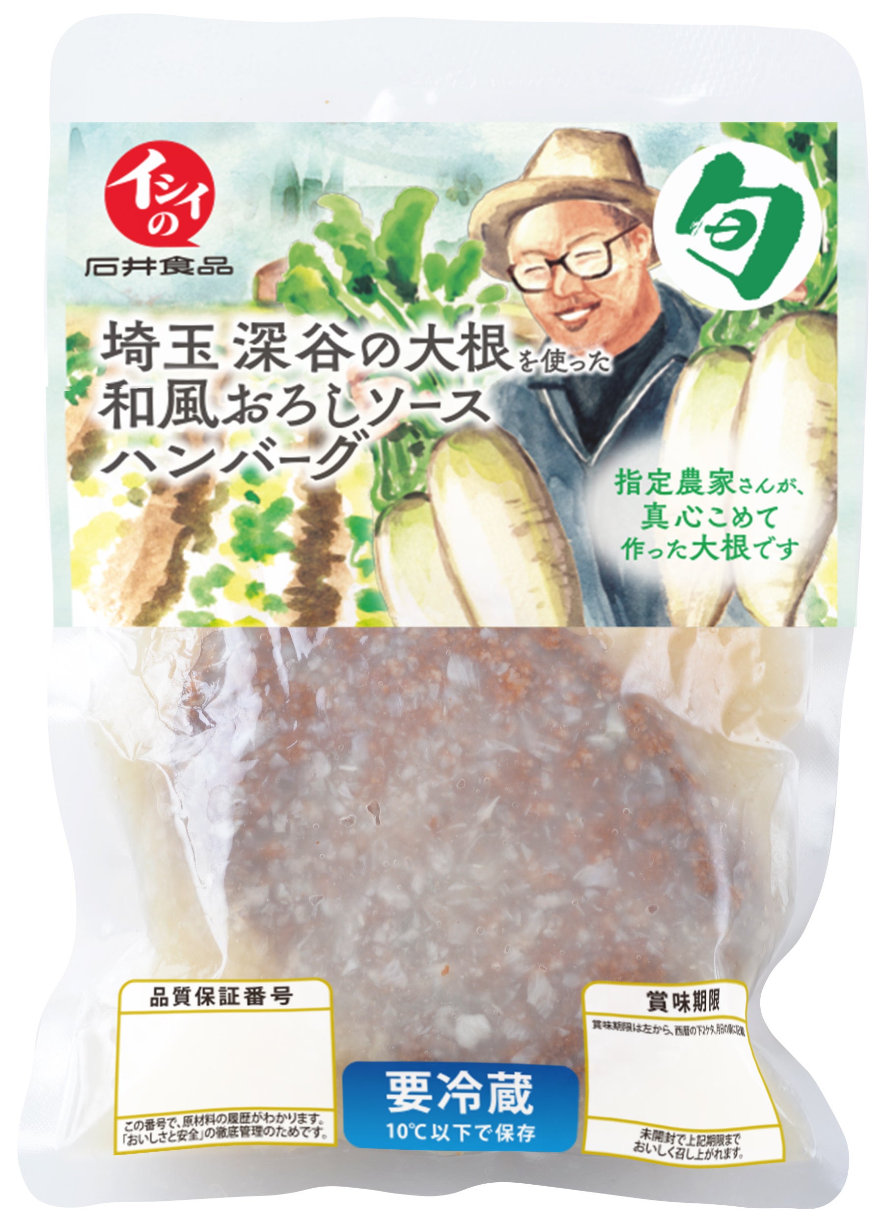 無添加調理※1 で商品作りを進めている石井食品株式会社(本社:千葉県船橋市、代表取締役社長執行役員:石井智康、以下、「石井食品」)は、埼玉・千葉を中心とした関東で「安く、おいしく」を提供する地域密着型スーパーマーケット株式会社ベルクと、2021 年より、生産者支援プロジェクトを立ち上げ、共に開発をした商品の売上の一部を、生産者のみなさまへ還元する取り組みをスタートし、今年もプロジェクト商品『埼玉深谷の大根ハンバーグ 和風おろしソース』を、旬の期間限定で3 月初旬※2 まで発売をいたします。