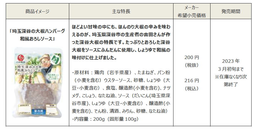 ~ 今年の埼玉県深谷の大根は、過去 28 年間作り続けて最高の出来! プロジェクト商品『埼玉深谷の大根ハンバーグ 和風おろしソース』を今年も期間限定で発売中 ~