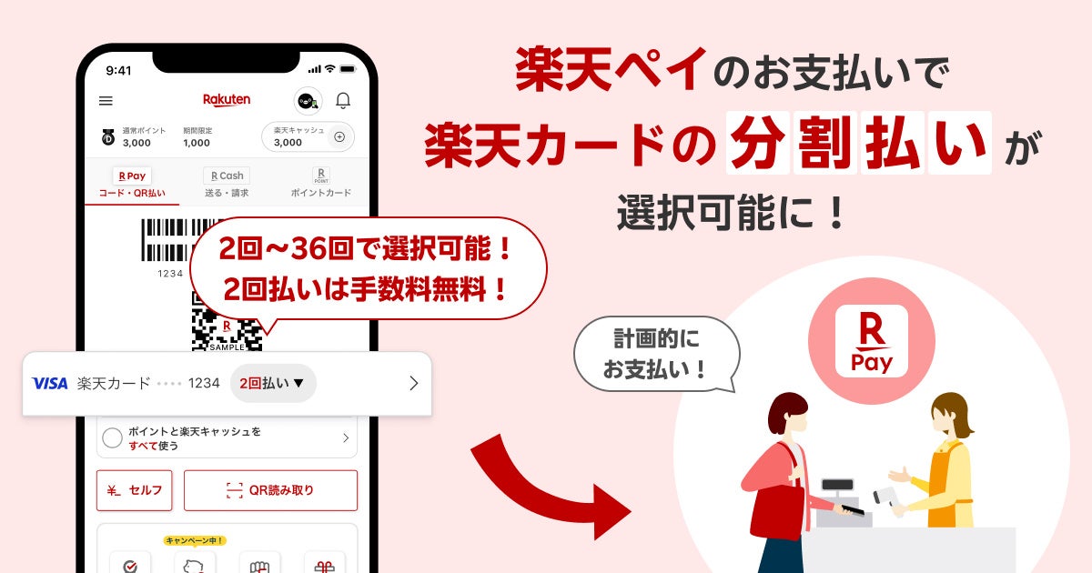 楽天カード株式会社(以下「楽天カード」)と楽天ペイメント株式会社(以下「楽天ペイメント」)は、楽天ペイメントが運営するキャッシュレス決済サービス「楽天ペイ」(注1)のお支払いで、「楽天カード」の分割払いを12月5日(木)より提供します(注2)。