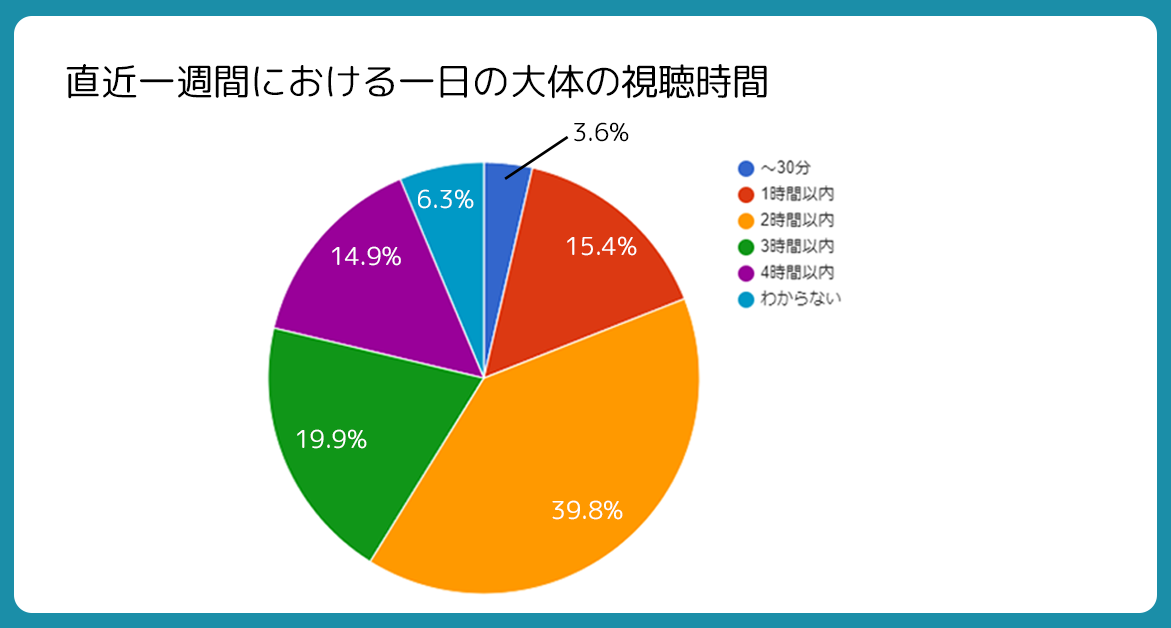 「直近一週間における一日の大体の視聴時間」において、「2時間以内」が最も多く記録され、その次に「3時間以内」の回答が続きました。「3時間以内」の回答は若干減ったものの(前回比-3%)、全体的な割合としては前回とほぼ同じ結果となりました。