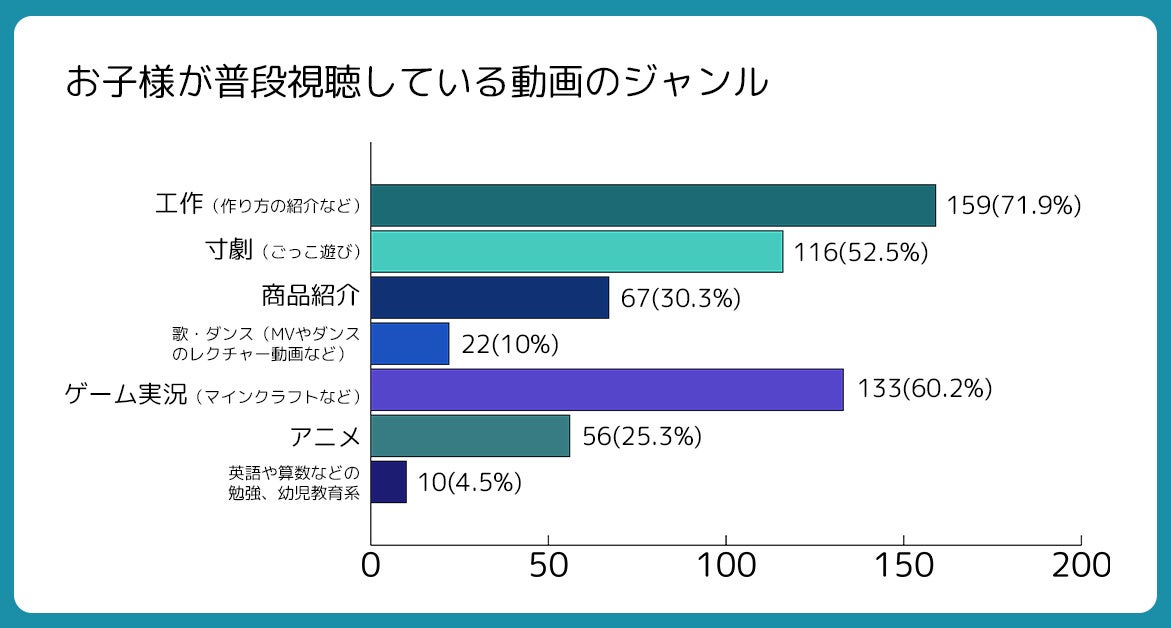 「お子様が普段視聴している動画のジャンル」という設問において、「工作(作り方の紹介など)」が159回、前回のアンケートでは4番目だった「ゲーム実況」が今回は2番目に回答の多い133回となりました。